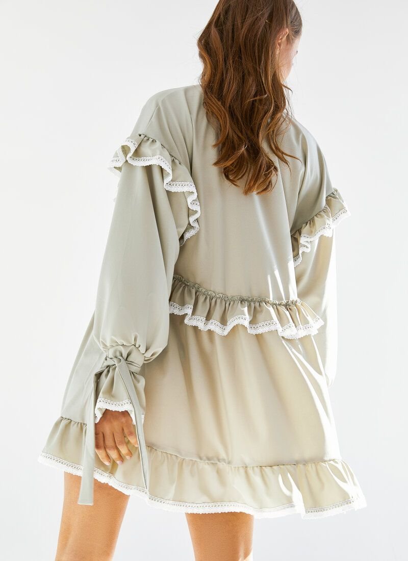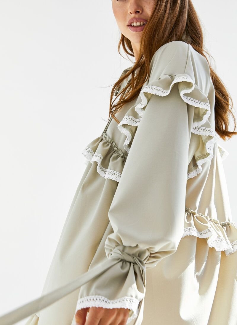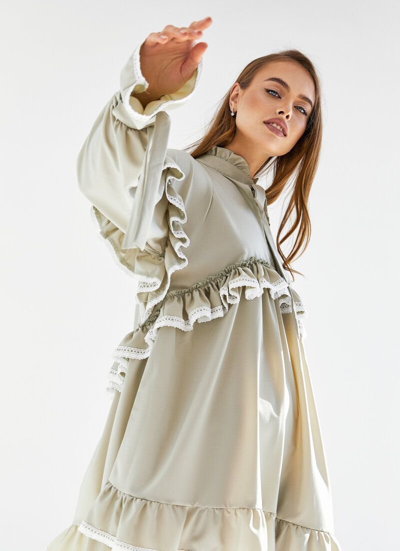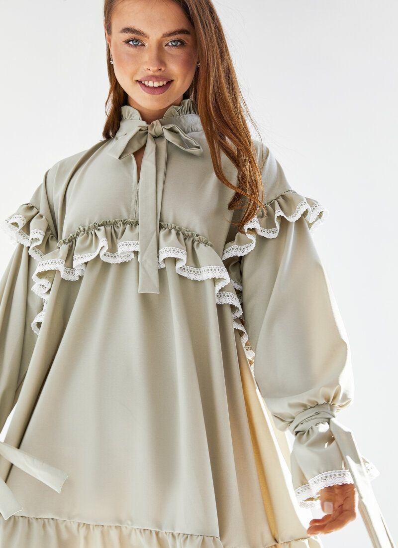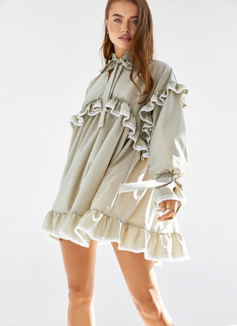 The olive dress is made of a lightweight material that maintains an optimal body temperature. The relaxed silhouette was decorated with flounces with contrasting openwork lace. The ascot collar emphasizes the neck.