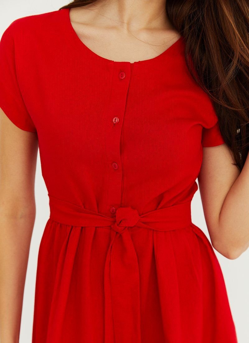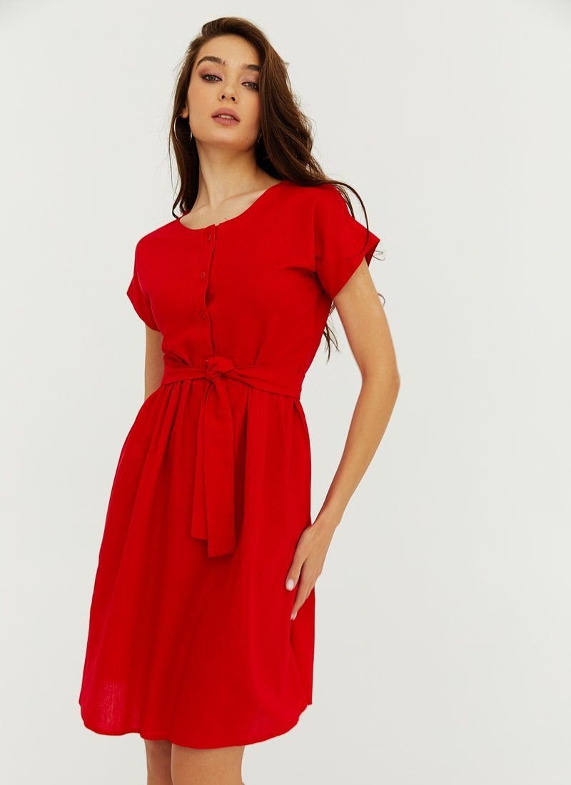 The dress is a win-win option for a casual summer look. Flaming red color, loose silhouette and light material will help to make the right impression. To emphasize the waistline will allow a belt-ribbon to match.