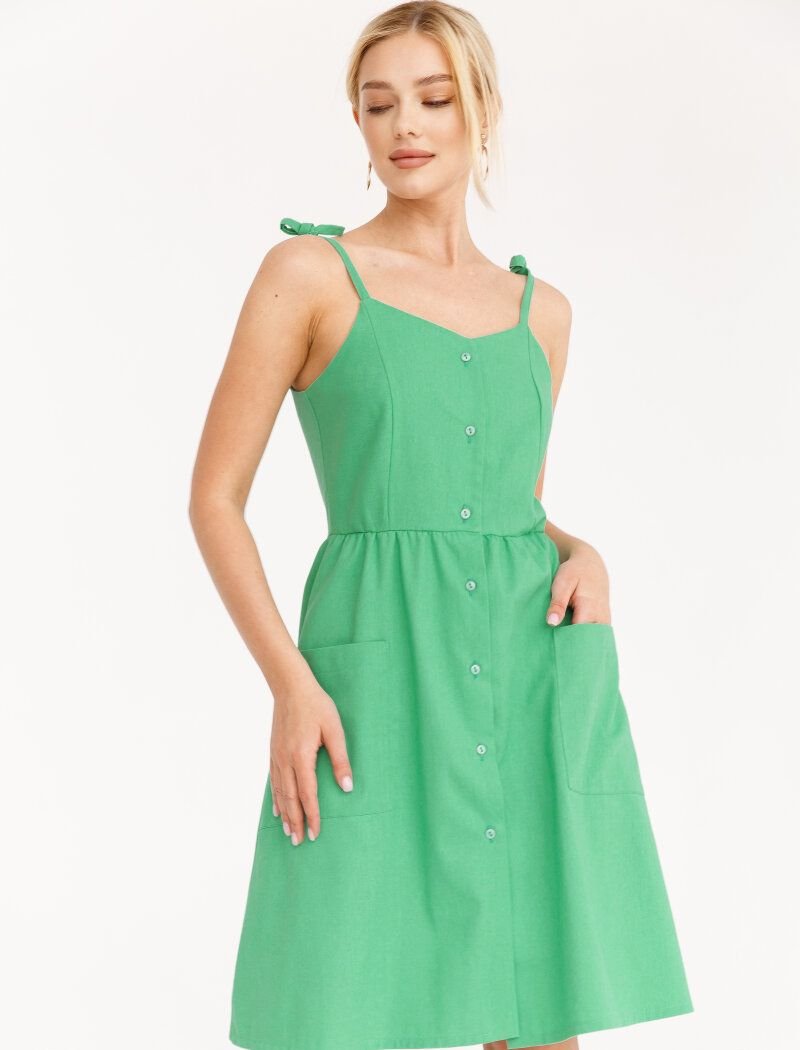 An open summer sundress of green color with thin adjustable straps-ties. There is a button placket along the entire length of the front, a cut-off waist with a flared skirt and two convenient patch pockets.