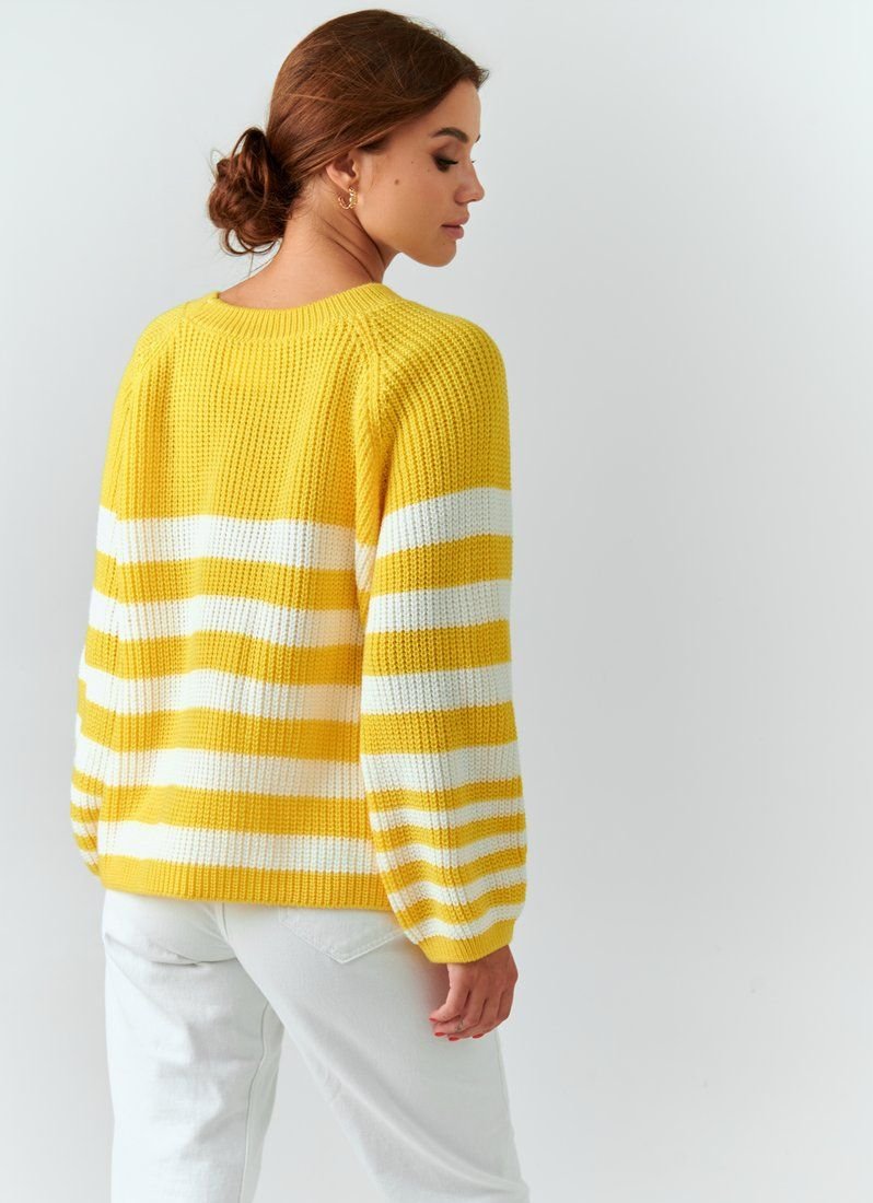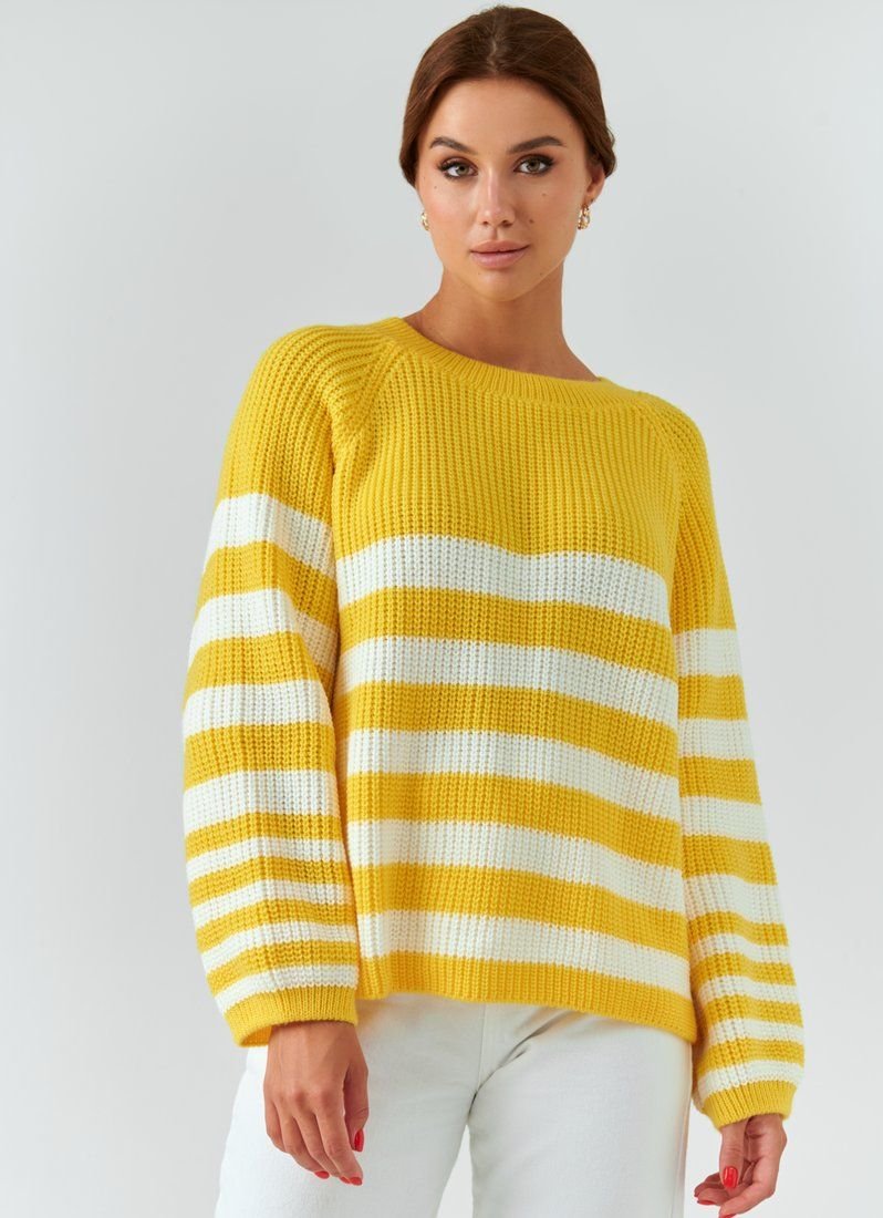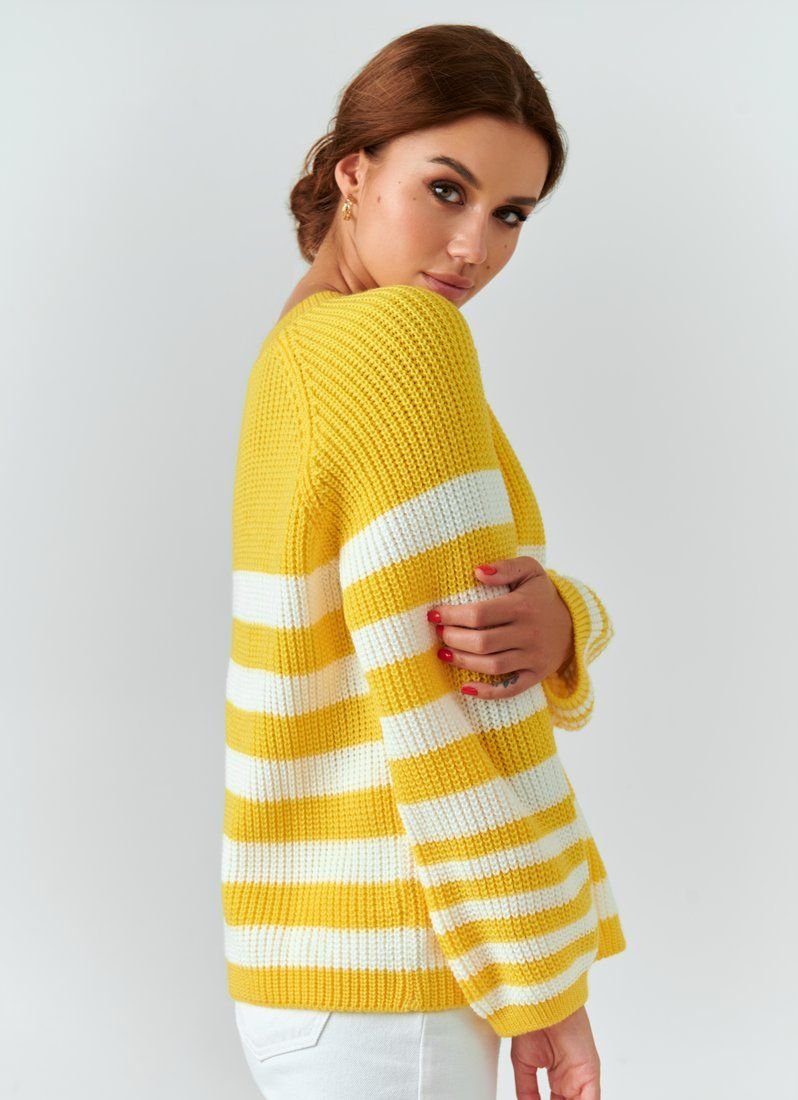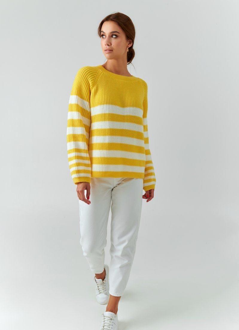 Oversize sweater of bright yellow color with a wide stripe. The product is made of a pleasant knitted knit and will keep you warm in the cool autumn and winter.