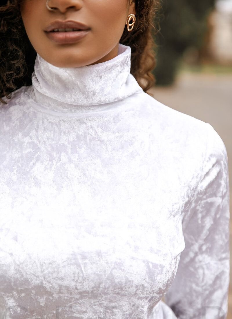 A velour turtleneck of a restrained cut with a golf collar and long sleeves.