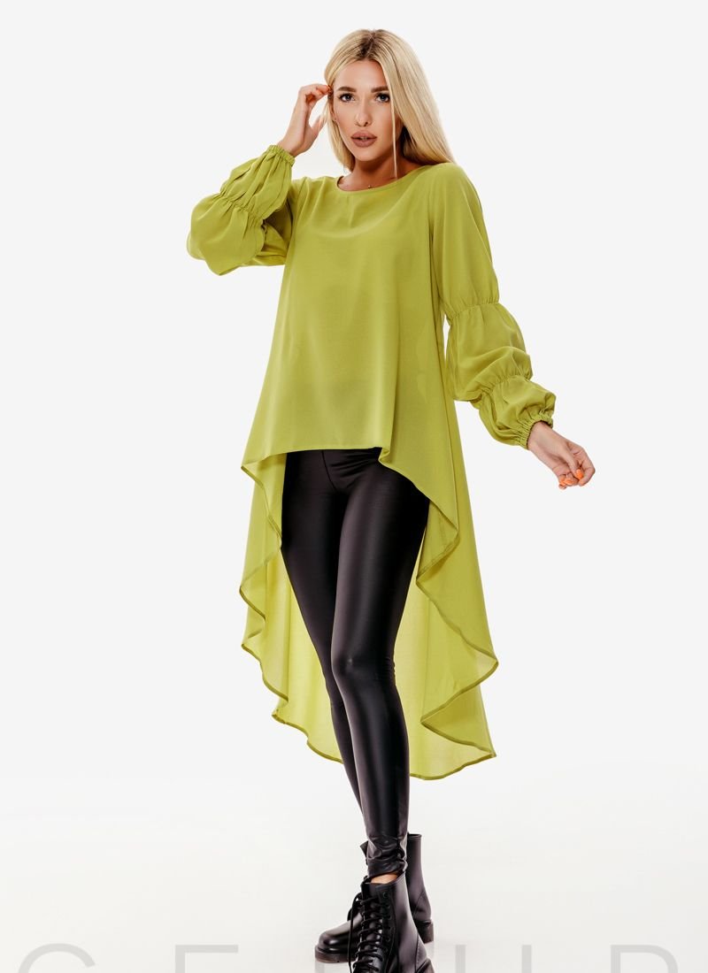 Light casual suit: asymmetric chiffon tunic-oversize with a long spectacular sleeve on an elastic cuff and an elongated back, leggings made of eco-leather with a narrow cut and an elastic insert on the waist.