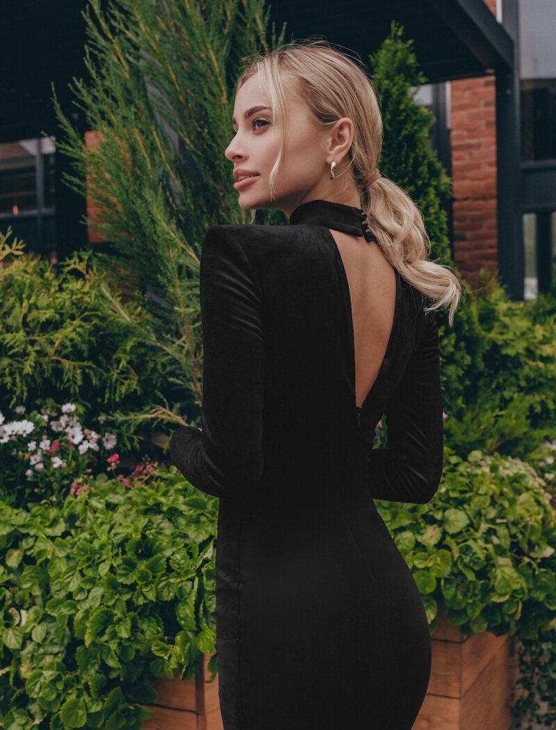 A short dress made of eco-suede, created by Gepur designers: a restrained cut, a stand-up collar with solid buttons, a deep v-neck at the back and a long sleeve with modeling foam inserts in the shoulders.