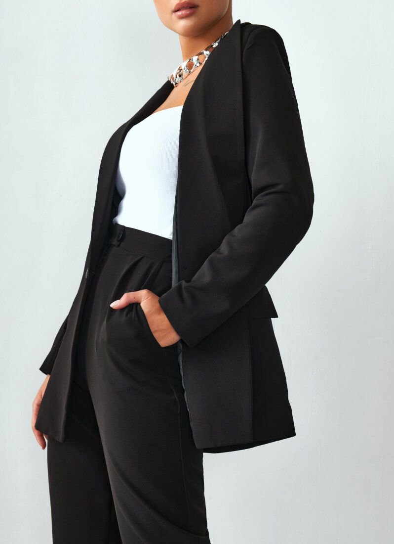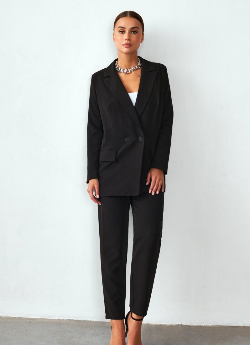 The suit will easily become the basis of a stylish image in a classic style. Jacket with long sleeves, turn-down collar with lapels, welt front pockets with flaps. The shoulder line is emphasized by foam inserts. Double-breasted button closure in contrasting color. Straight trousers with a high fit complement the look.