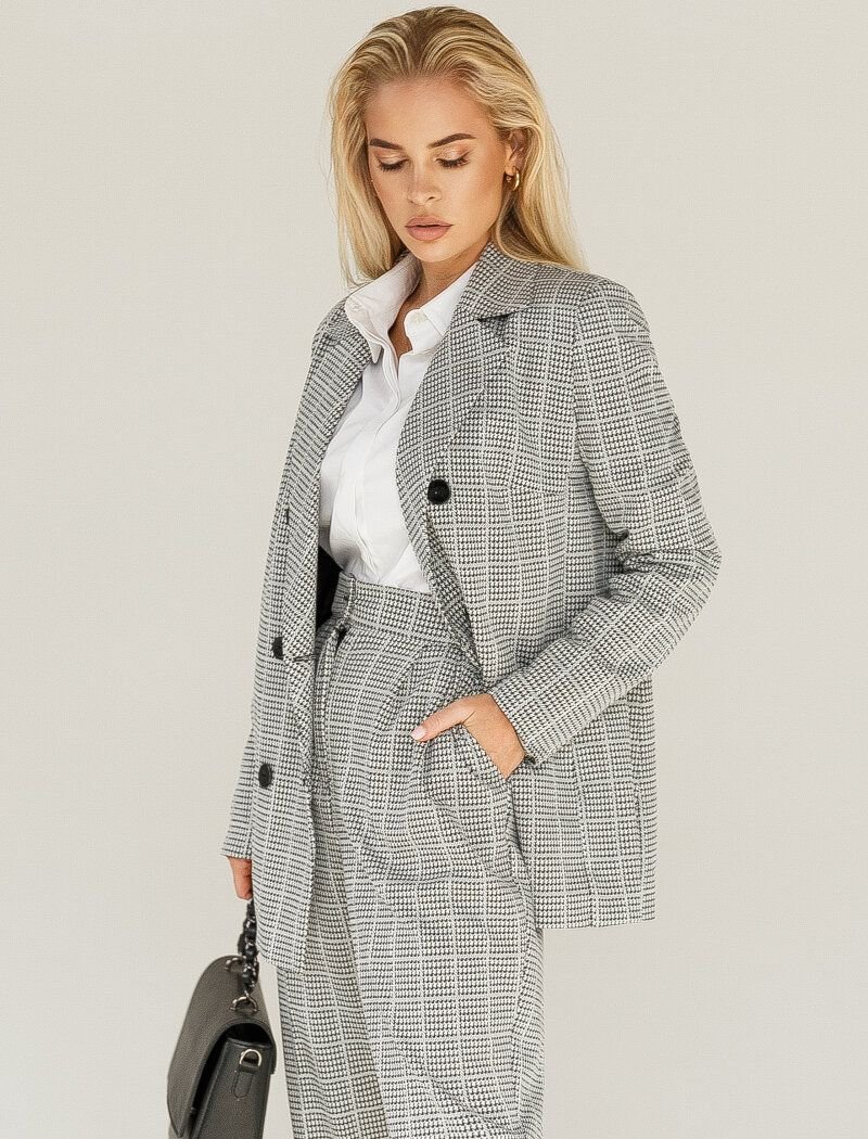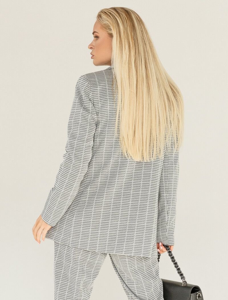 The jacket has become a "must have" thing in any wardrobe. The product will make a profitable tandem with jeans and a T-shirt|as well as with a pencil skirt or blouse and wide trousers. Double-breasted jacket made of soft|pleasant to the touch fabric. The interweaving of black and white threads forms the "crow's foot" ornament. A clearly defined shoulder line is formed with the help of foam inserts. Side welt pockets are made on the front shelf.