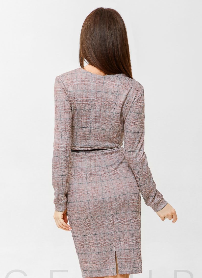 An elegant dress of a tight-fitting cut made of light plaid knitwear: a small v-neck in front, neat lapels, a long sleeve with a narrow cuff, a waistband and a midi skirt with two pockets on the sides and a small slit in the back.