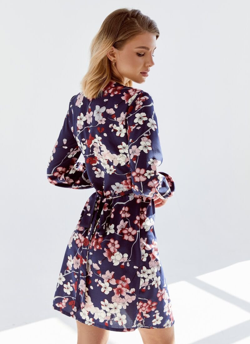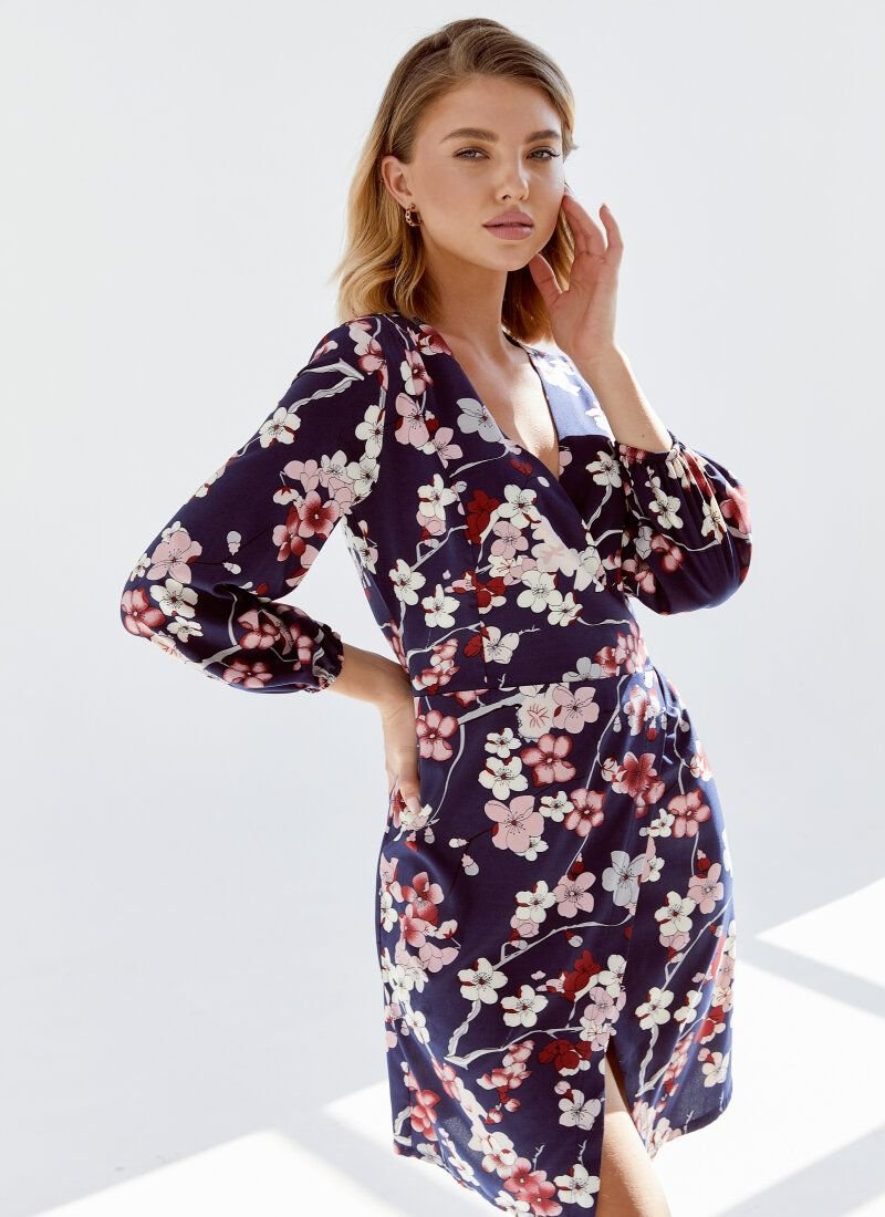 Floral print does not look corny, especially in spring. A dress with a large contrasting motif forms a feminine silhouette, due to the cut on the smell. The length of the mini and the side slit favorably emphasize the legs. The ¾ sleeves are complemented by elastic cuffs.