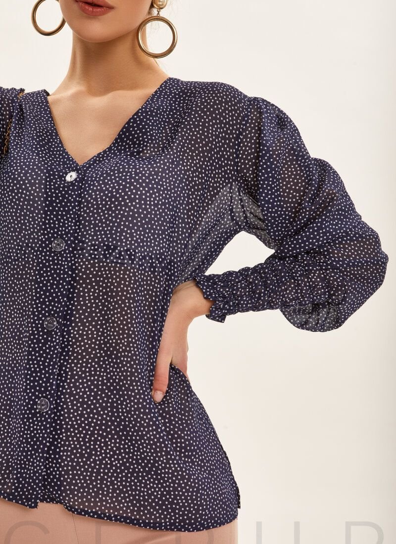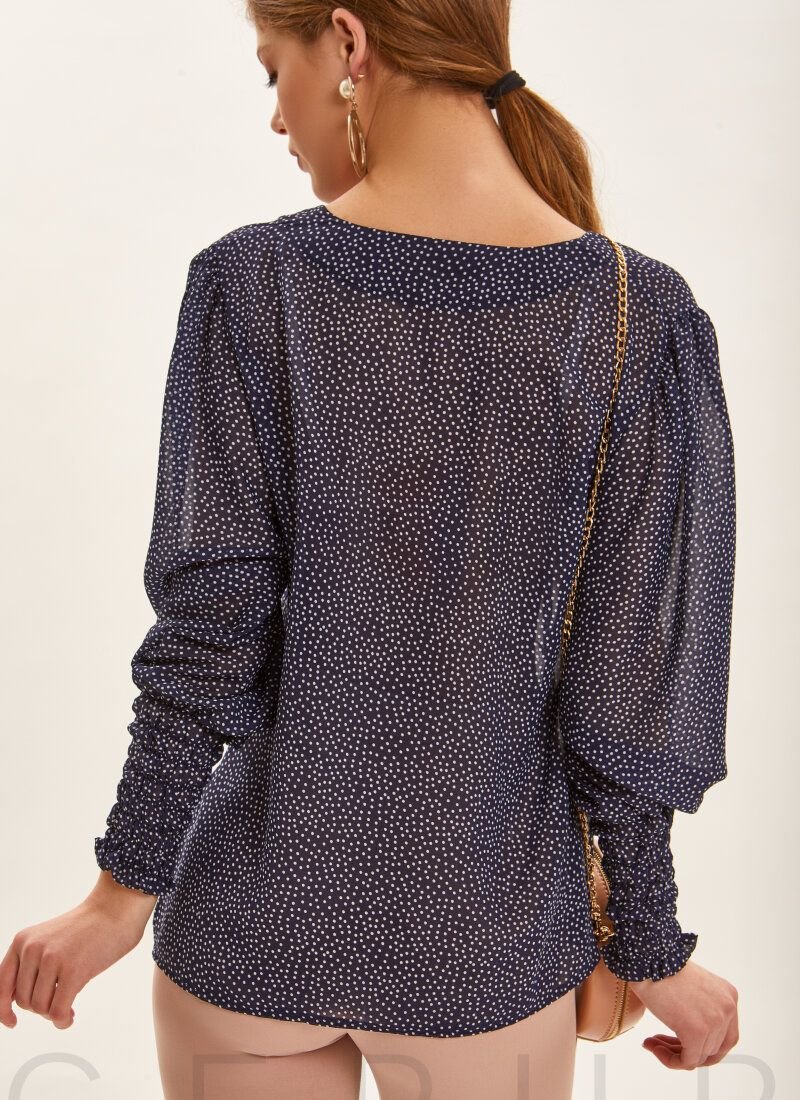 Blouse with a loose fit in a pea print. Deep V-neck. Long voluminous sleeve with elastic cuff.