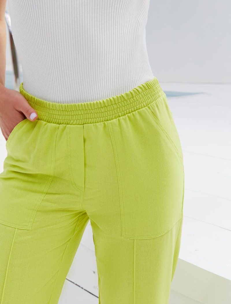 Light green joggers with pockets and a wide elastic waistband are a good investment in the everyday wardrobe of the spring-summer season. The legs were supplemented with fixed arrows that visually stretch the silhouette. For sewing the product, the designers used a thin, light material.