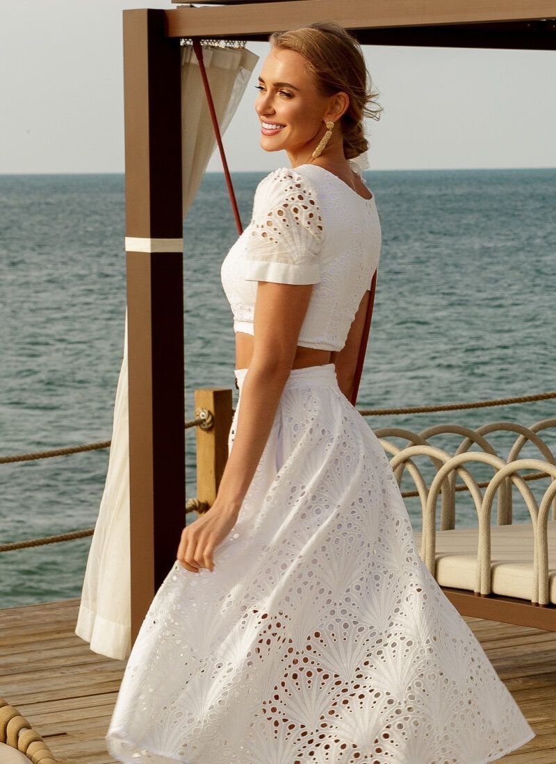 A short-sleeved top and a full skirt create the perfect combination for a feminine summer look. The skirt is complemented by a decorative button placket and a hidden zipper at the back. The top with a deep neckline, short sleeves is buttoned.