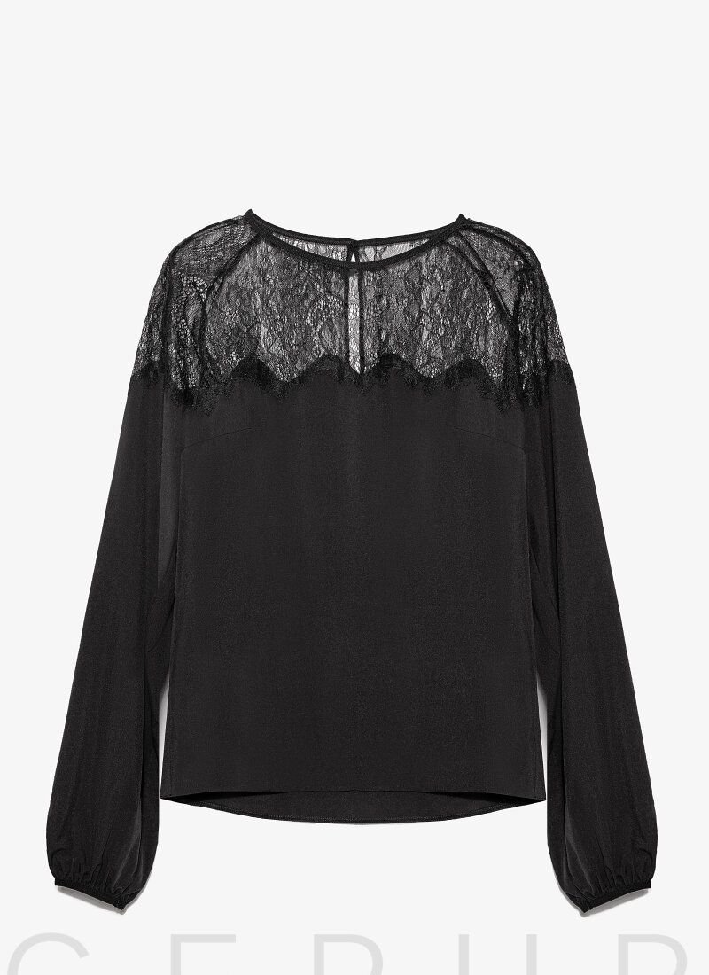 Romantic blouse of restrained black color: loose silhouette, round neck, long voluminous sleeve on elastic cuff, the yoke is decorated with refined lace.