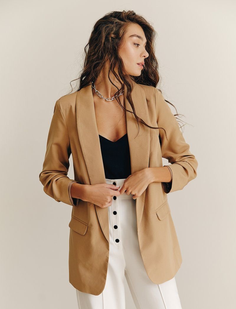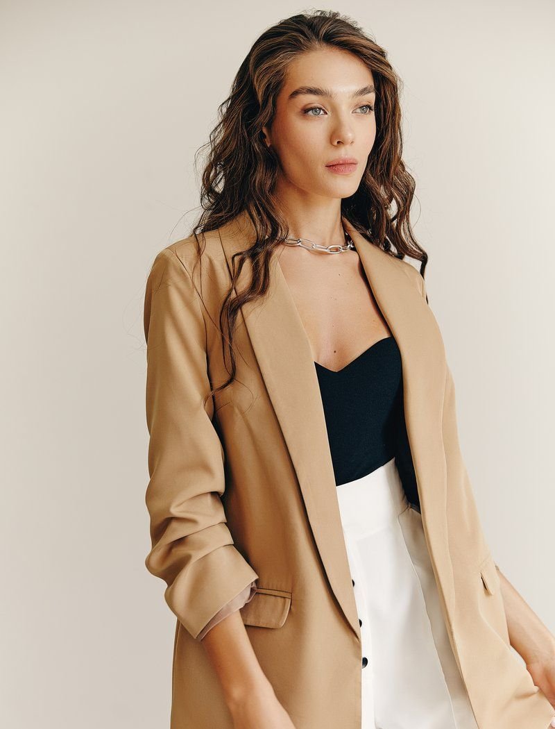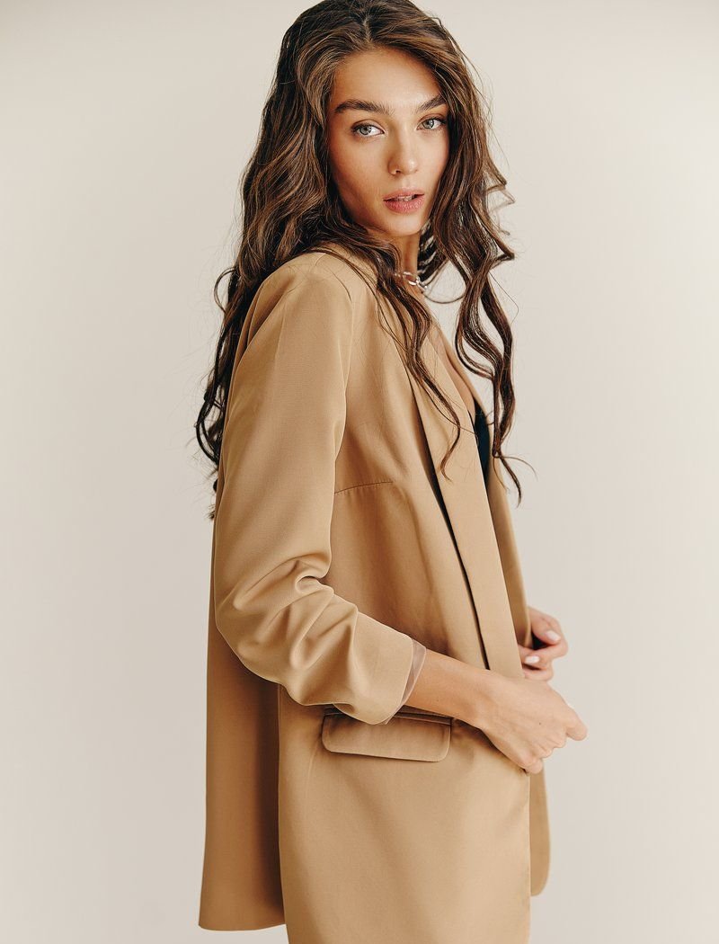 Camel-colo#FF0000 jacket with a turn-down collar|does not fasten. Inserts are provided in the shoulders|which helps to keep the shape|a shortened sleeve with an assembly|with pockets. It can be combined with both trousers and jeans.