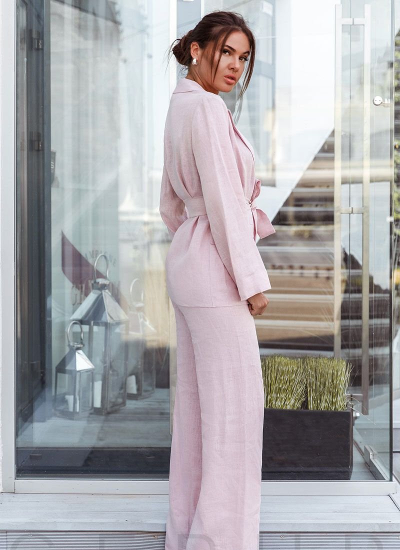 Trendy pantsuit from Gepur designers, sewn from premium-class fabric: jacket in the oversize style, with a plain belt, welt pockets with a flap, a classic turn-down collar and lapels, loose-fitting trousers with a high fit. ..