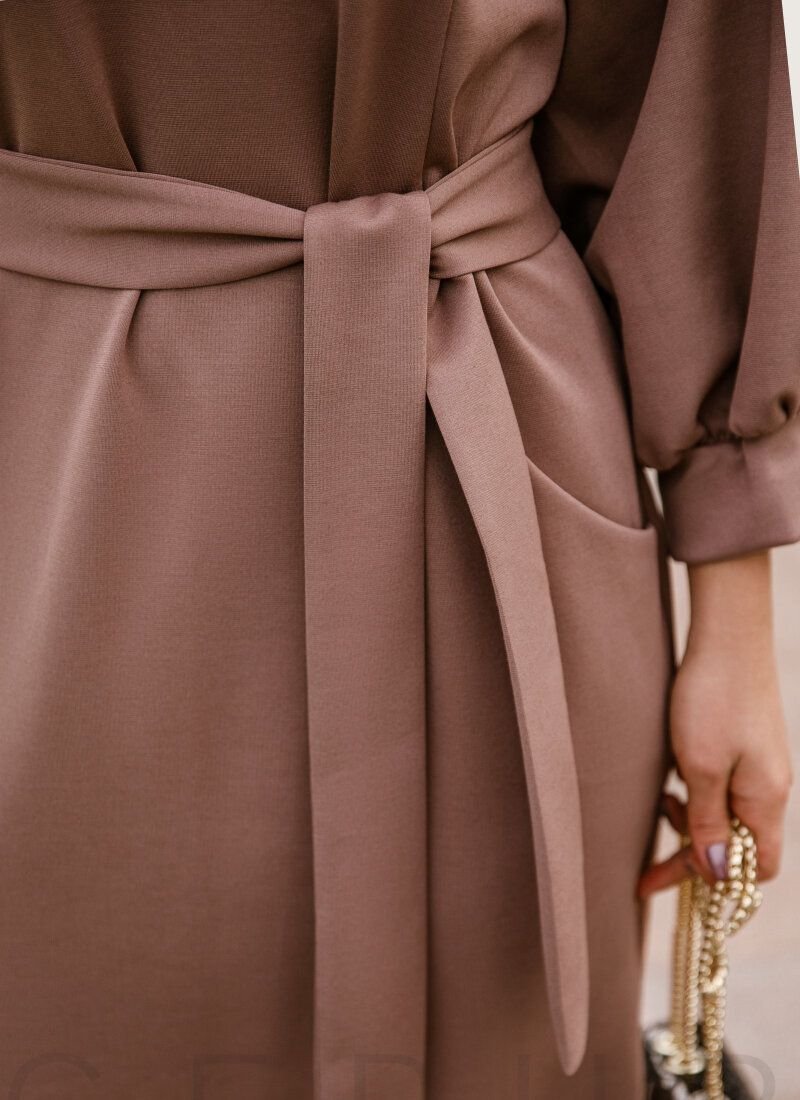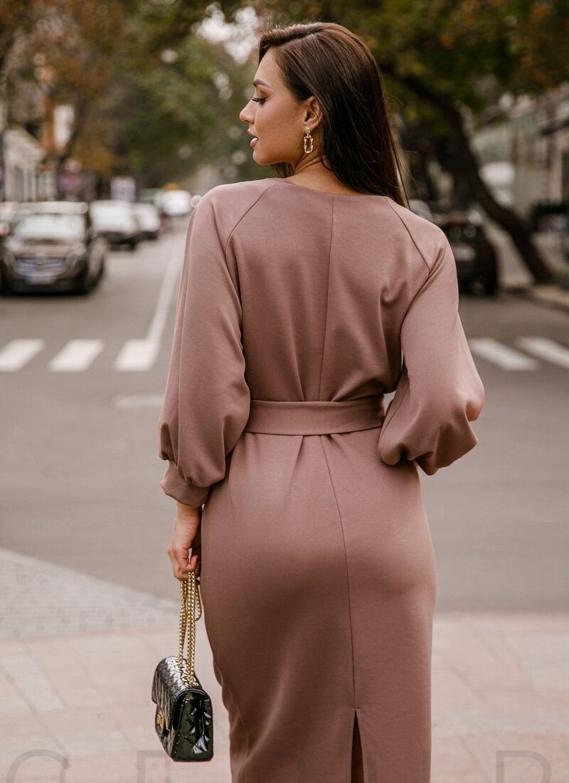 A fitted midi dress made of elastic Italian knitwear: round neck, one-piece voluminous sleeves on a wide cuff, modeling recesses, two side pockets in the seams, a straight-cut skirt with a slit in the back, complemented by a removable plain belt.