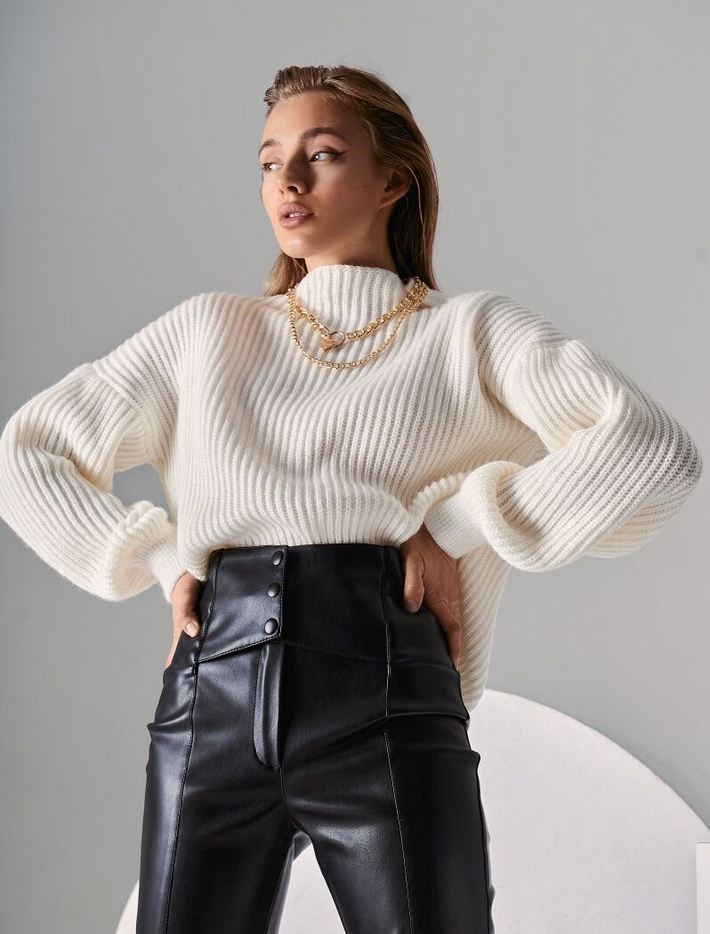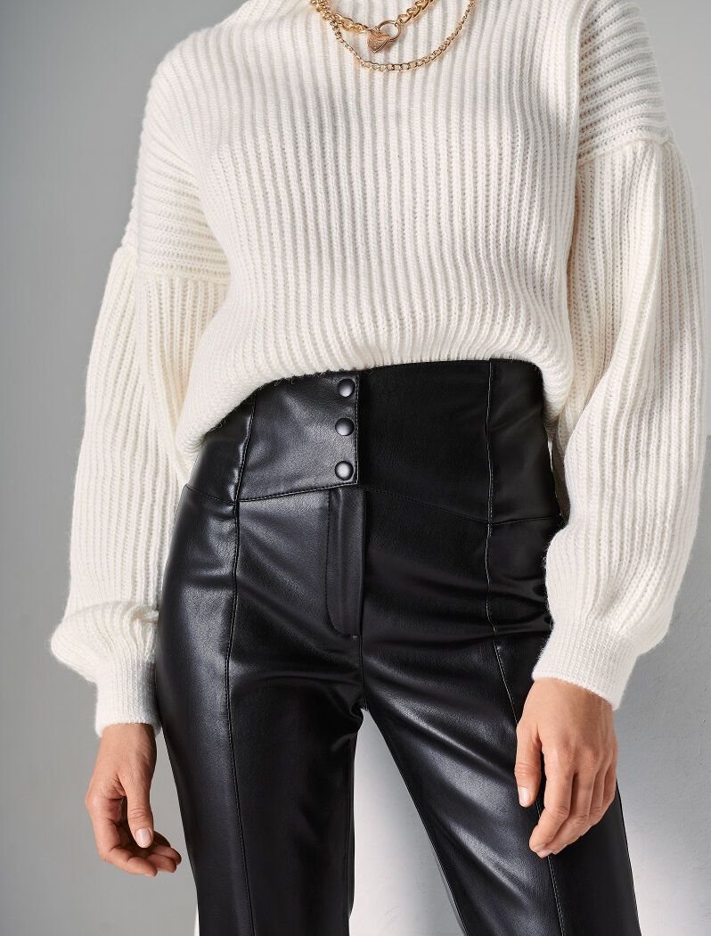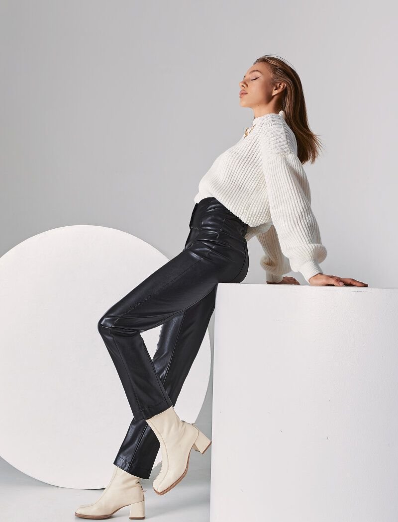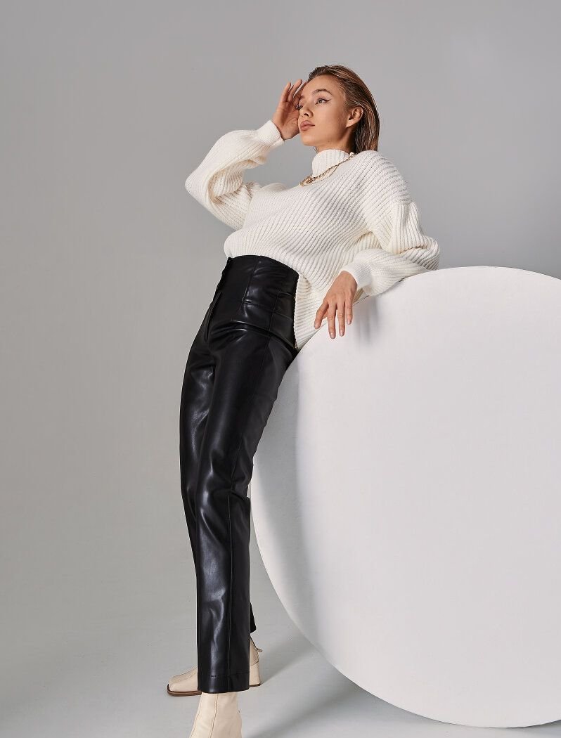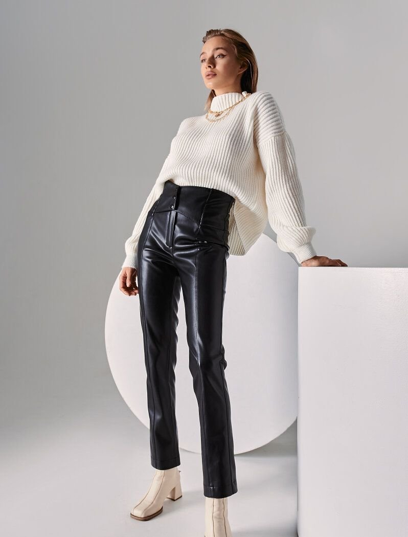 Gepur designers offer to support the trend for a leather texture, with the help of stylish tight-fitting trousers. The neutral black model is complemented by a wide belt on the buttons it allows you to adjust the perfect fit. The pleasant suede base of the material allows you to feel as comfortable as possible.