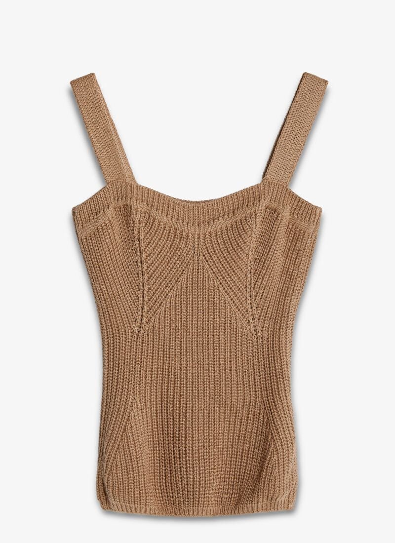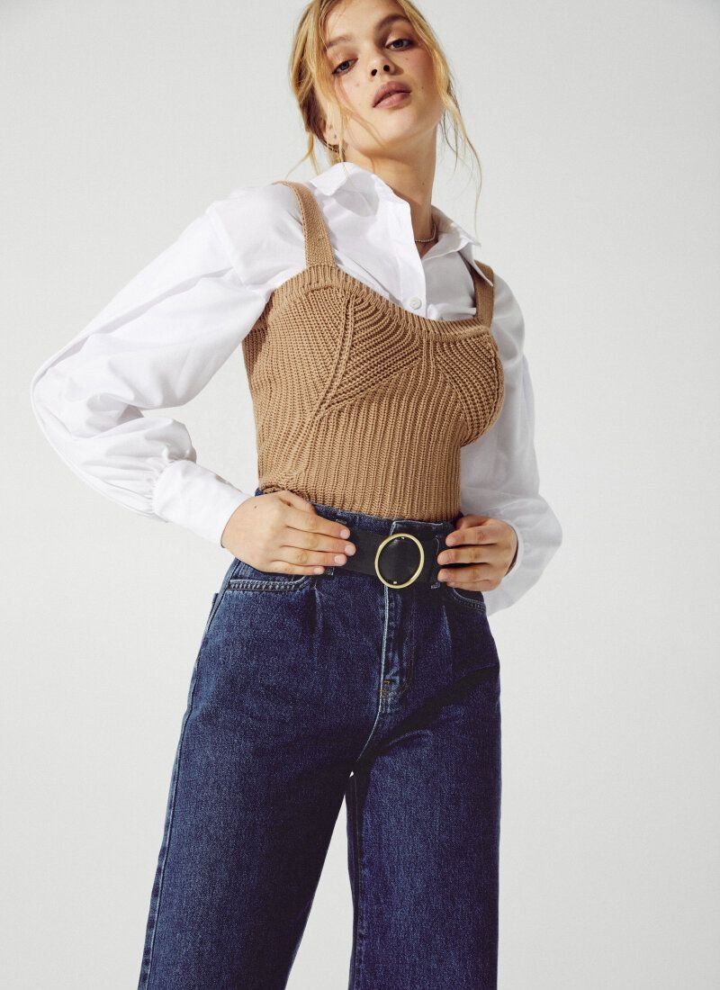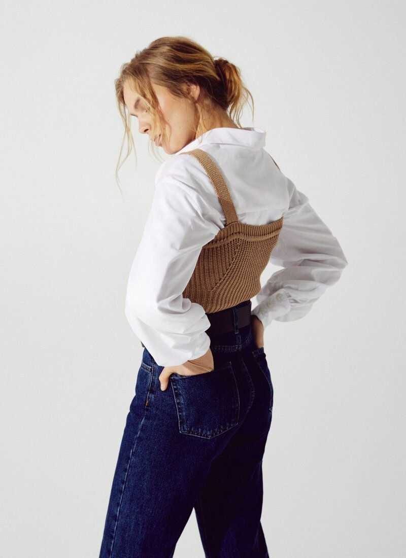 The beige T-shirt is made of textured knitted material. The model is complemented by a curly neckline in the spirit of the SS?21 Givenchy and Alberta Ferretti shows and is perfect for multi-layered images.