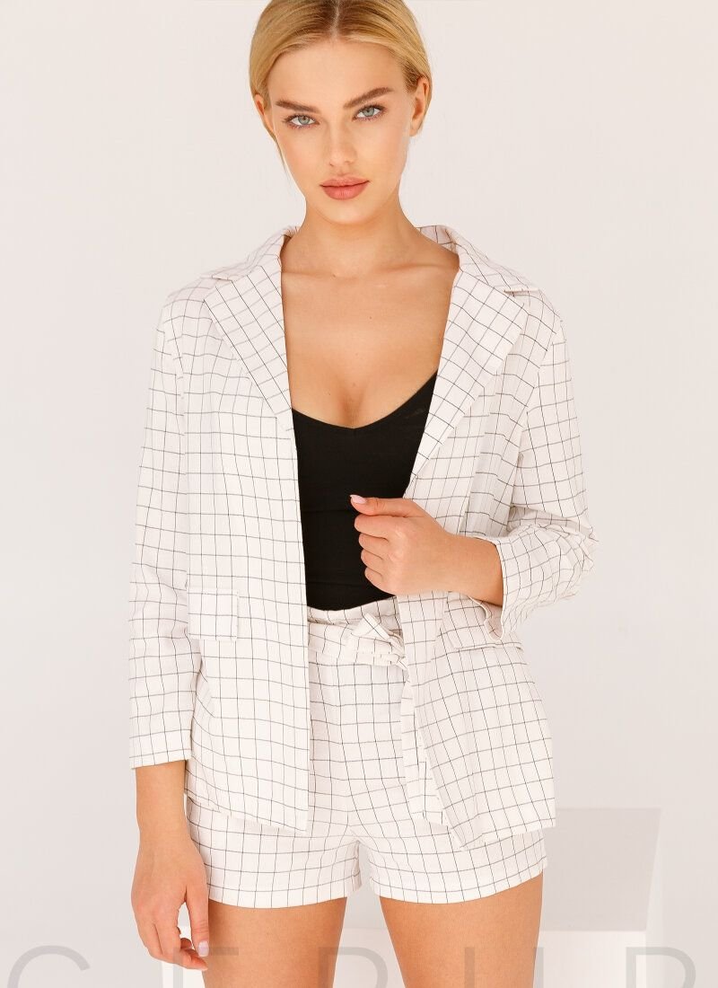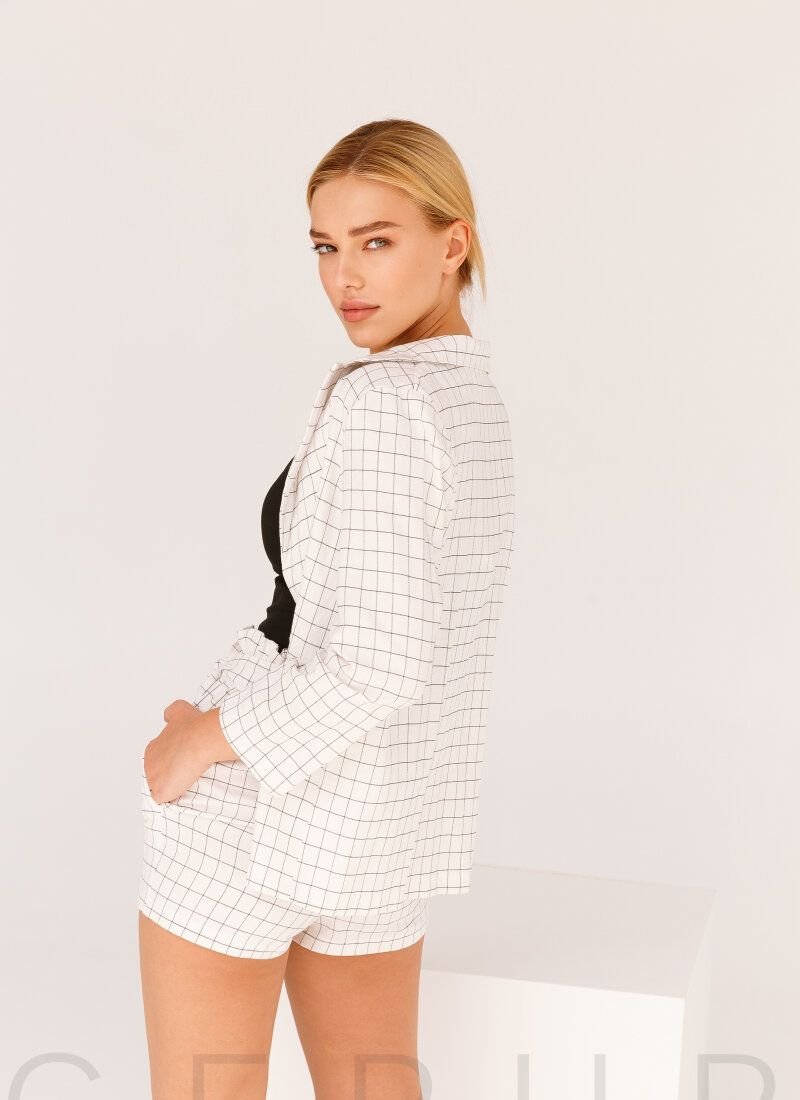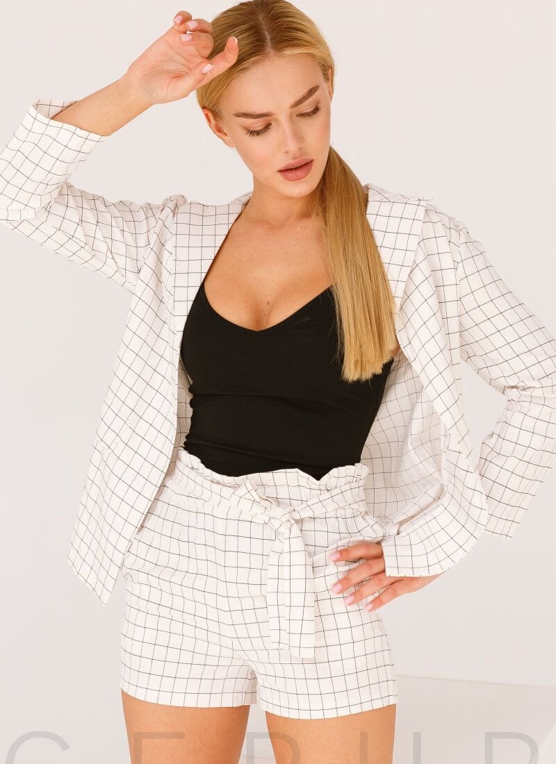 Elegant casual suit in white with a checkered print: a classic jacket without buttons with a turn-down collar and lapels, two decorative flap pockets in front. Shorts with an elastic insert at the waist and two pockets in the seams, complemented by a removable fabric belt to match.Please note that the model's print has changed (see additional photos).
