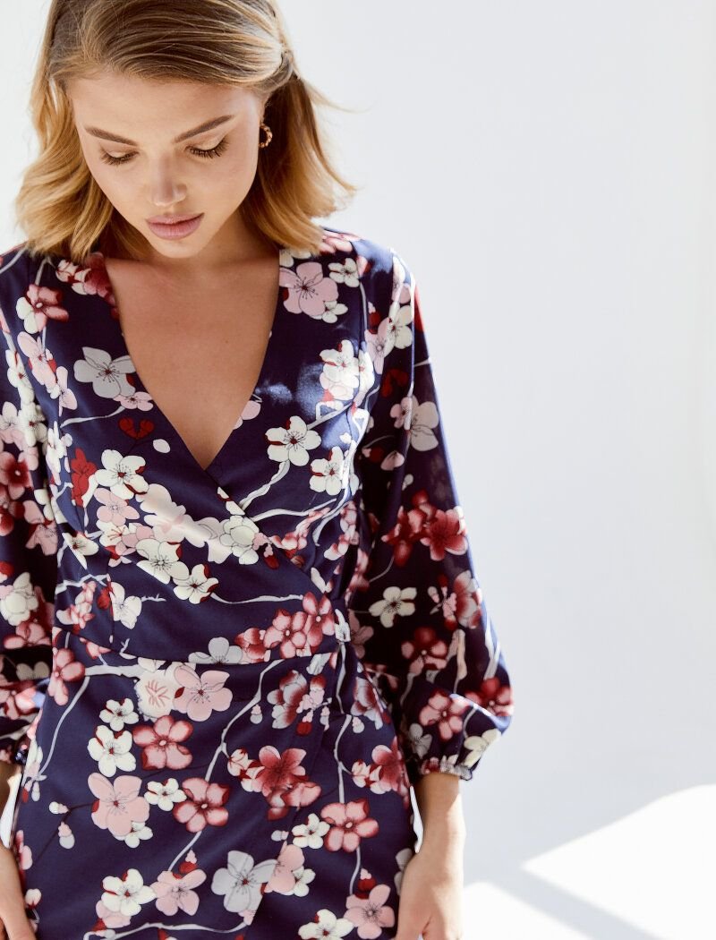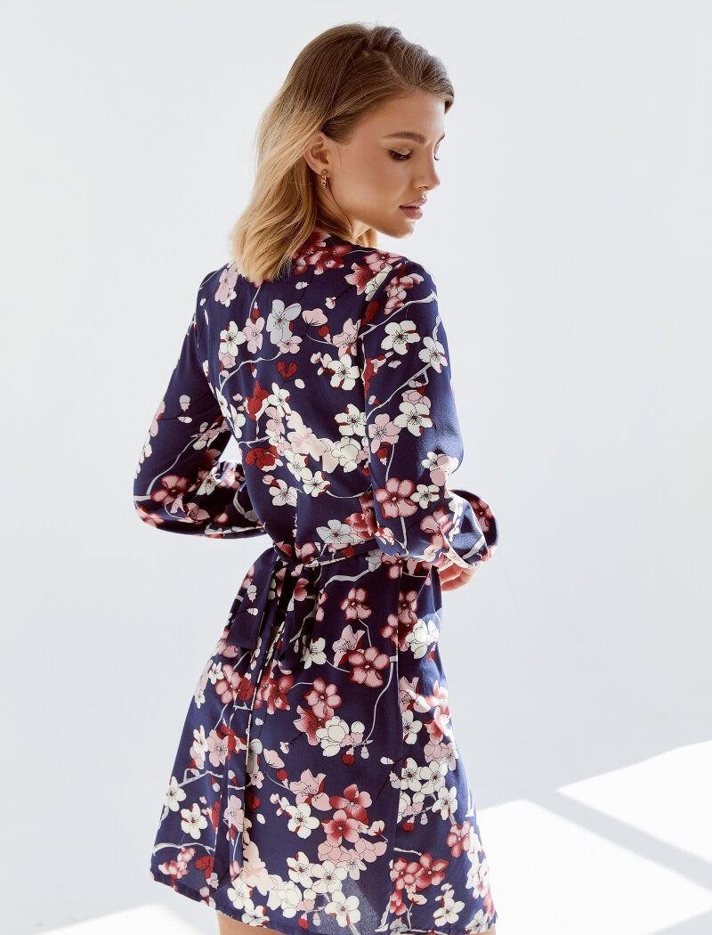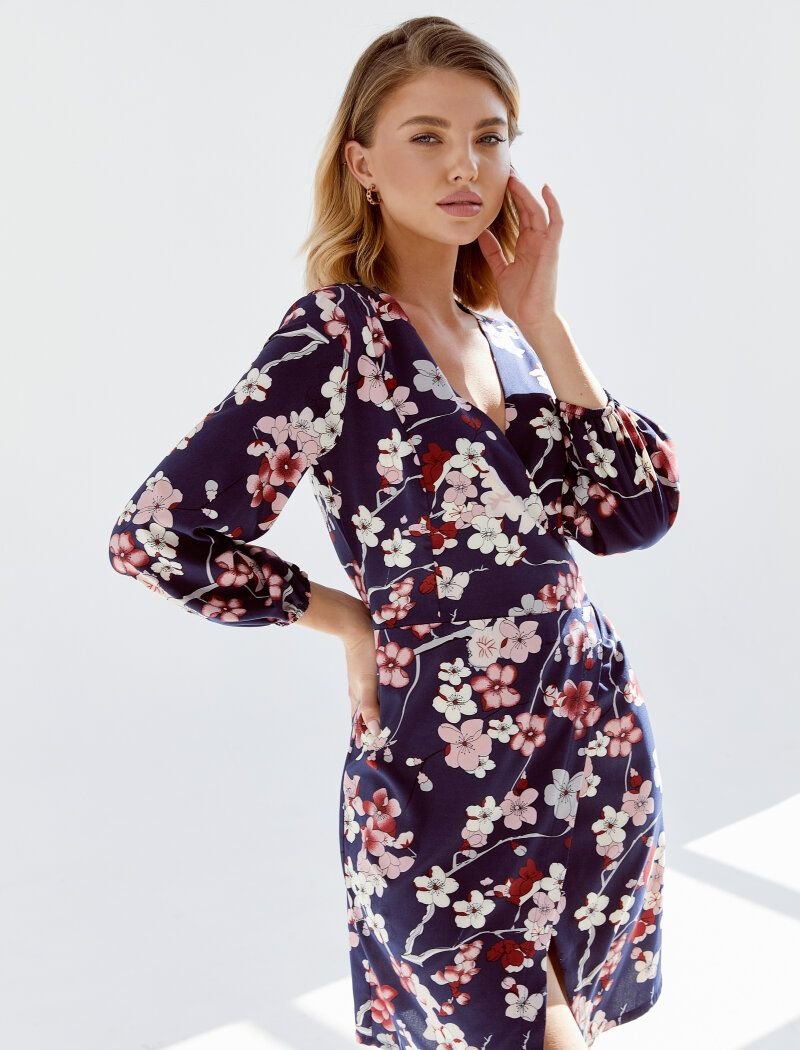 Floral print does not look banal, especially in spring. A dress with a large contrasting motif forms a feminine silhouette, due to the cut on the smell. The length of the mini and the side cut favorably emphasize the legs. Sleeves ? they are complemented by elastic cuffs.