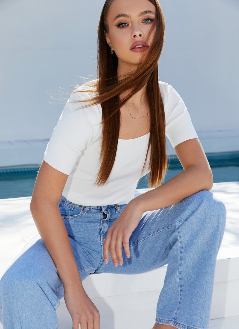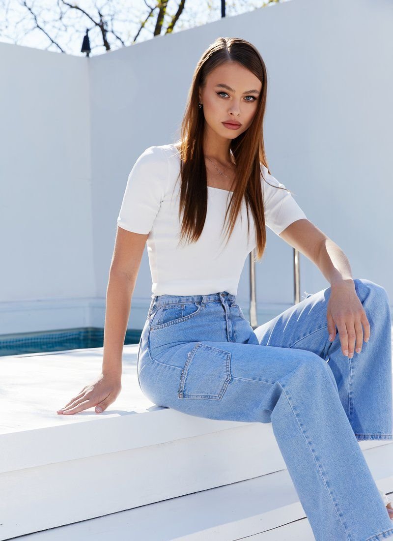 The white tight-fitting T-shirt was sewn from soft knitwear, which does not leave the list of trends in SS'21. A one-color thing will easily play into both an everyday and a more complex image.