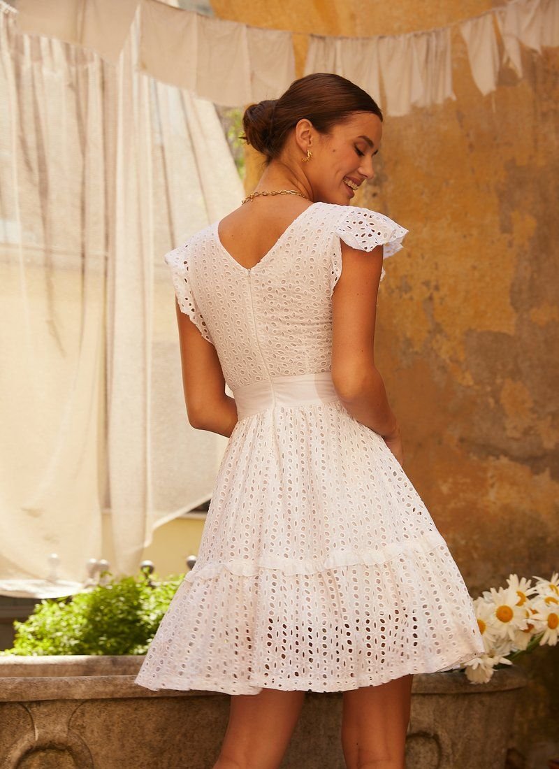 A short white dress made of cotton fabric with embroidery is the best solution for the summer season! A slightly flared skirt with a tie-in belt is complemented with ruffles. The triangular neckline delicately opens the chest and back, and the airy wing sleeves add lightness to the image.