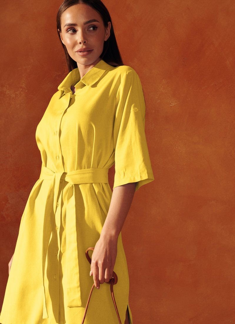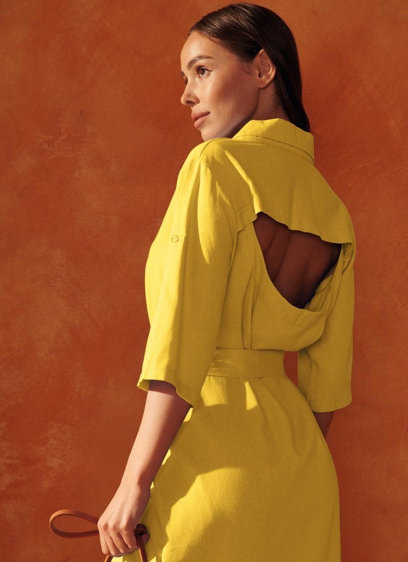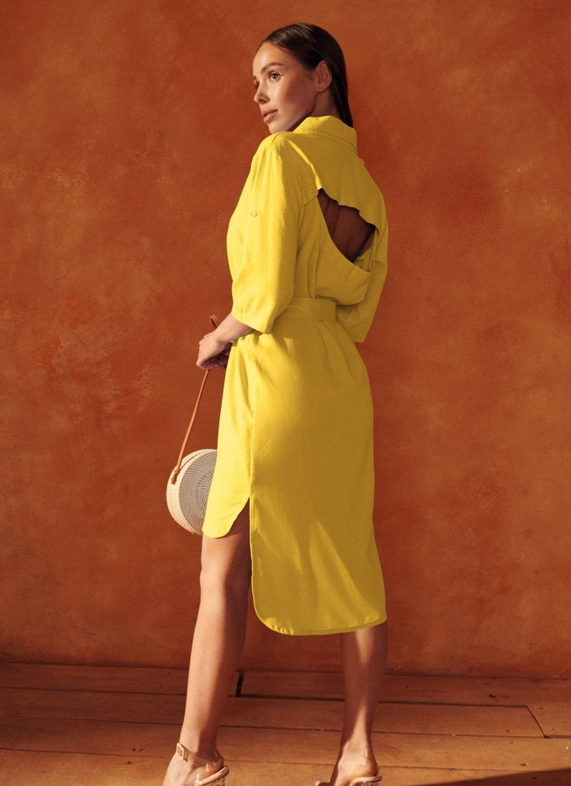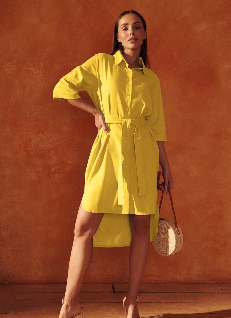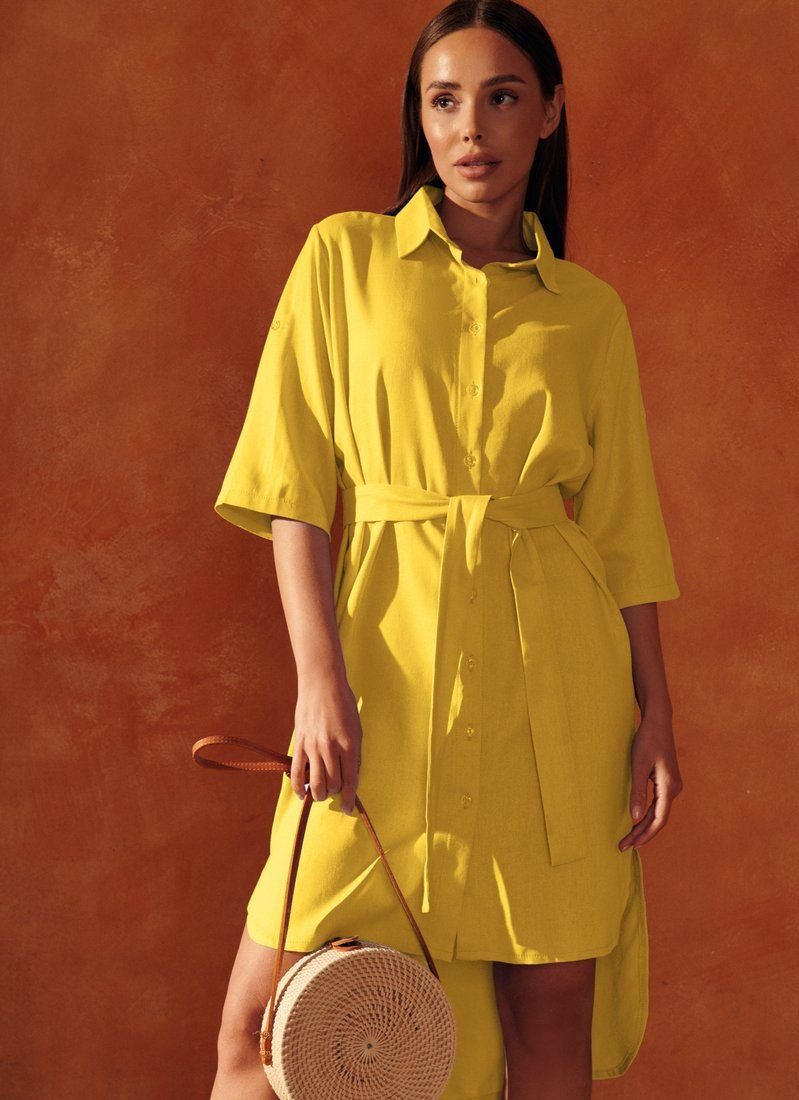 At the seasonal shows of FW’20/21, Celine and Chloé included shirt dresses in their collections. The asymmetrical yellow model with short sleeves with patch fasteners is complemented by a cutout on the back. The waist is formed by a removable belt-ribbon.