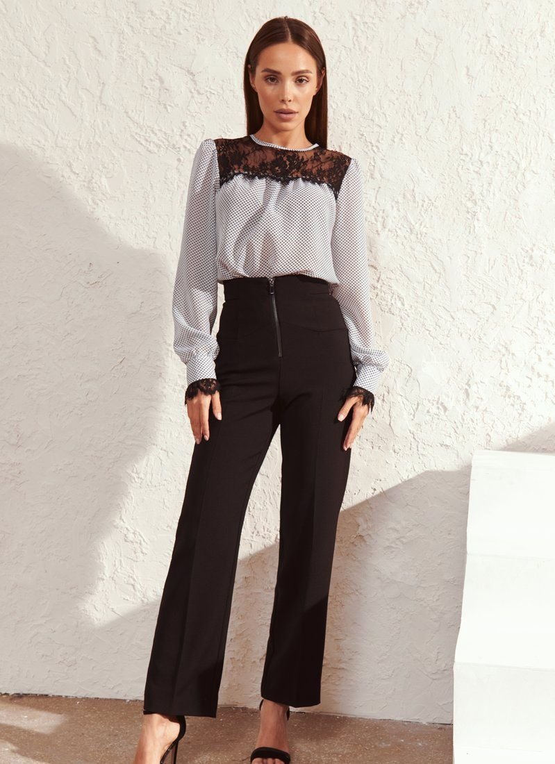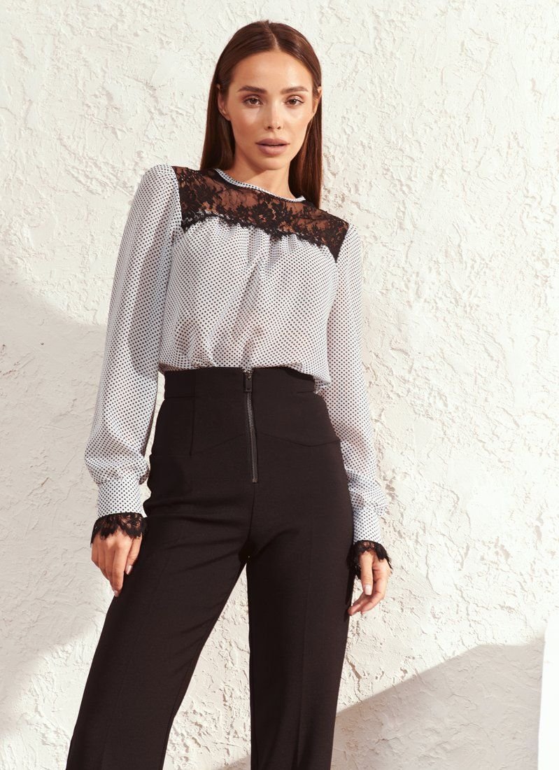 The black and white blouse includes romance to the maximum. This is responsible for the light airy chiffon in small polka dots - a print that has become universal in the women's wardrobe according to Vogue. The mood is also supported by lace with a floral motif on the yoke and cuffs of the sleeves.