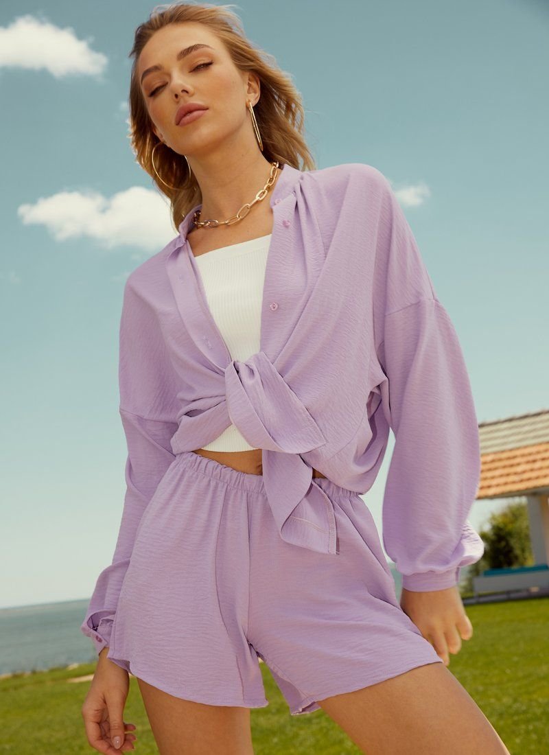Bright summer set made of soft pressed fabric. A loose-fitting shirt with a chest pocket and a rounded hem. short shorts with a comfortable fit with two small pockets on the sides.