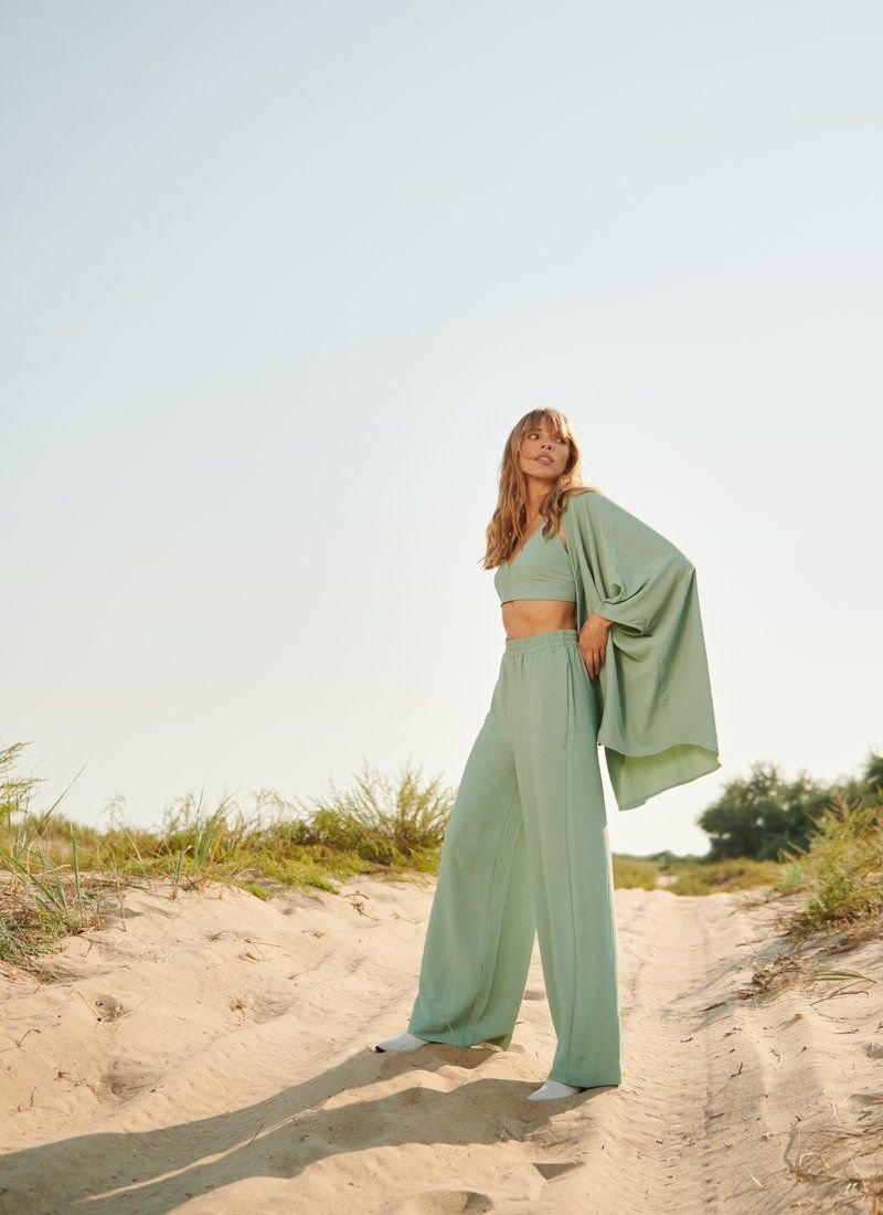 Comfortable casual three-piece set made of soft pressed mint-colored fabric. It includes a crop top with thin straps with an elastic back, flared trousers with a high fit and two pockets on the sides, as well as a loose cardigan with short sleeves.