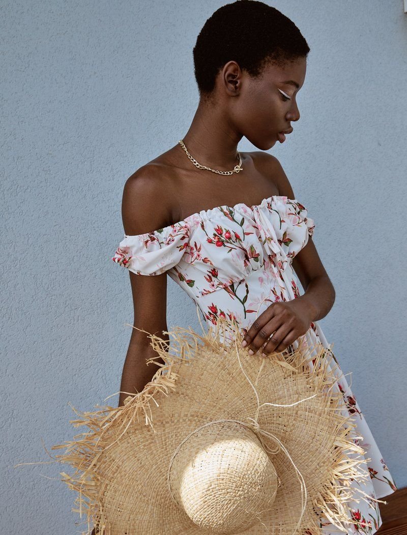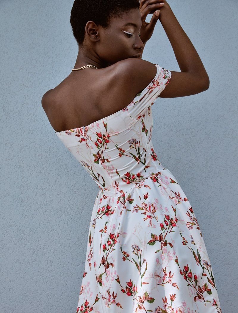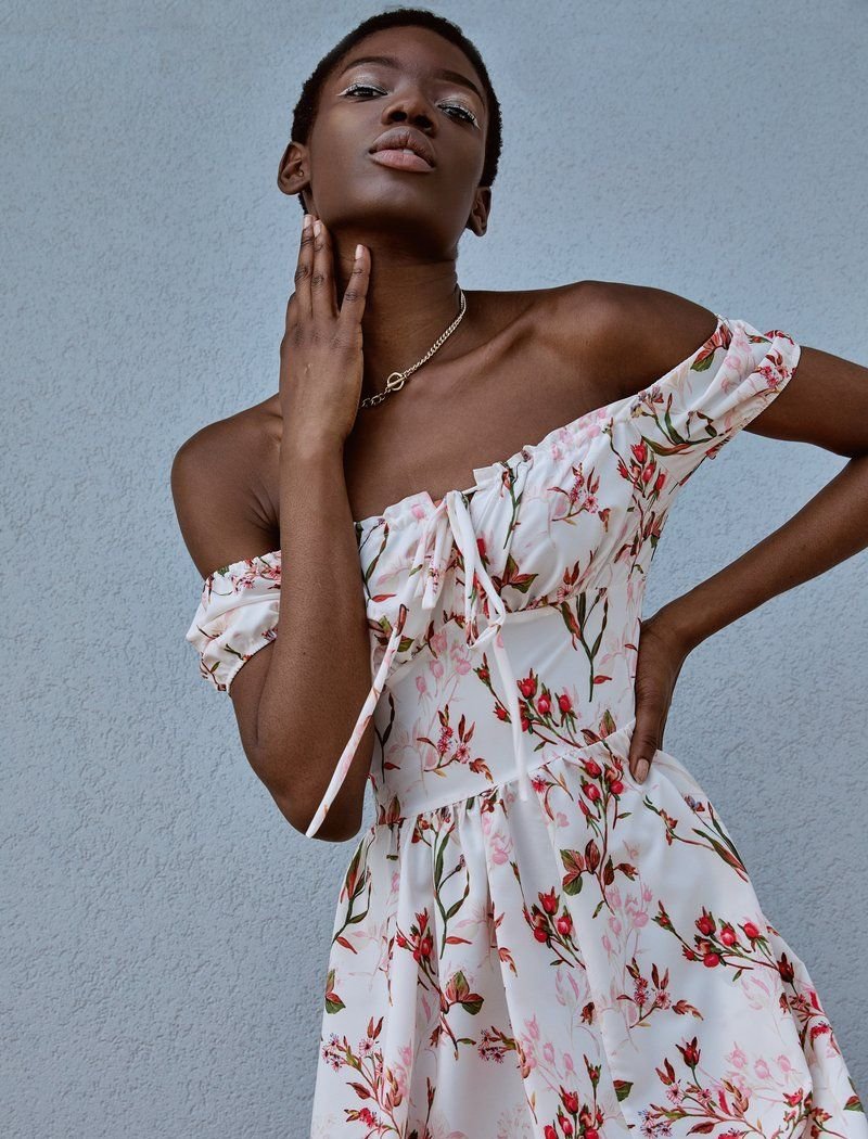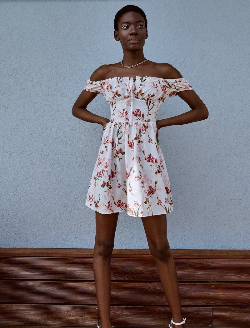 A white mini dress does not require additional accessories. The role of the decor is a fitted cut with a tie-in belt, an open shoulder line with a drawstring, and most importantly-a floral print. This pattern is included in the list of current trends of the SS'21 season. Please note that the print has changed a little (see additional photos from 14.07).