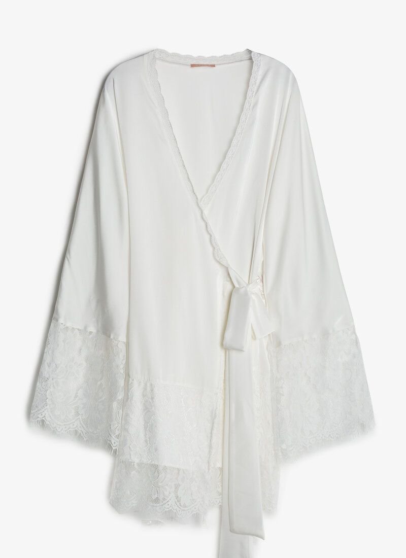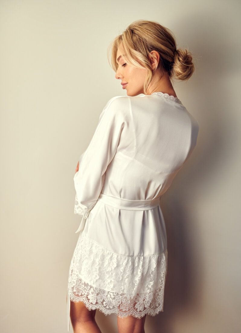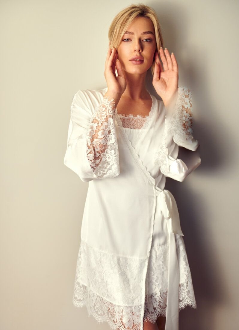 The white robe is made of fine silk fabric with an unobtrusive shine. The masters of the Gepur brand emphasized the neckline with inserts of floral lace to match. Openwork inserts on the sleeves and hem add sexiness to the product, and a plain belt-ribbon helps to adjust the fit of the robe.