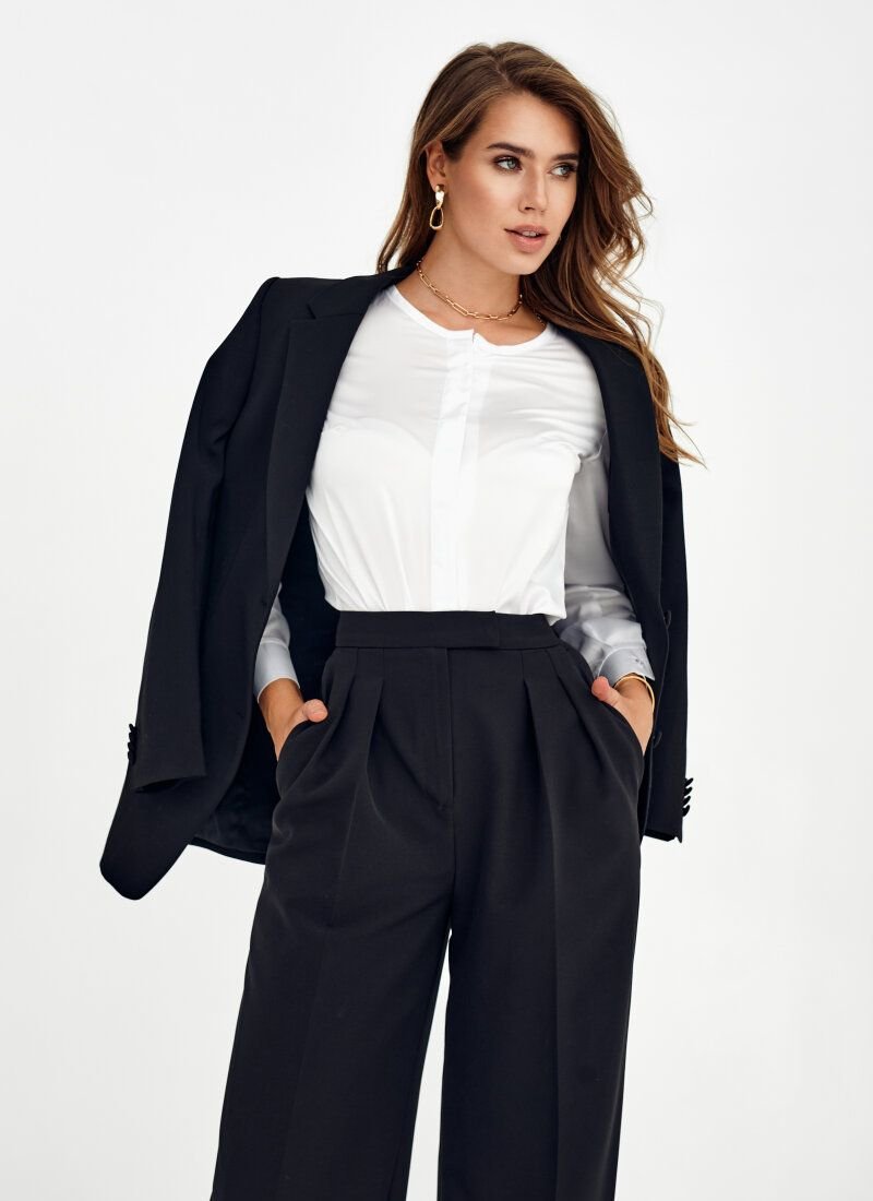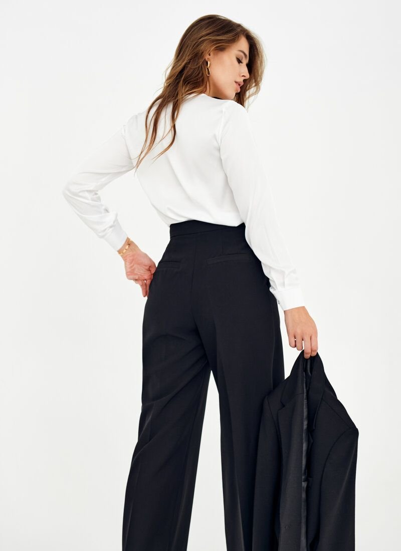 A strict silk blouse, white with a round neck, long sleeves and a hidden placket with buttons in front.