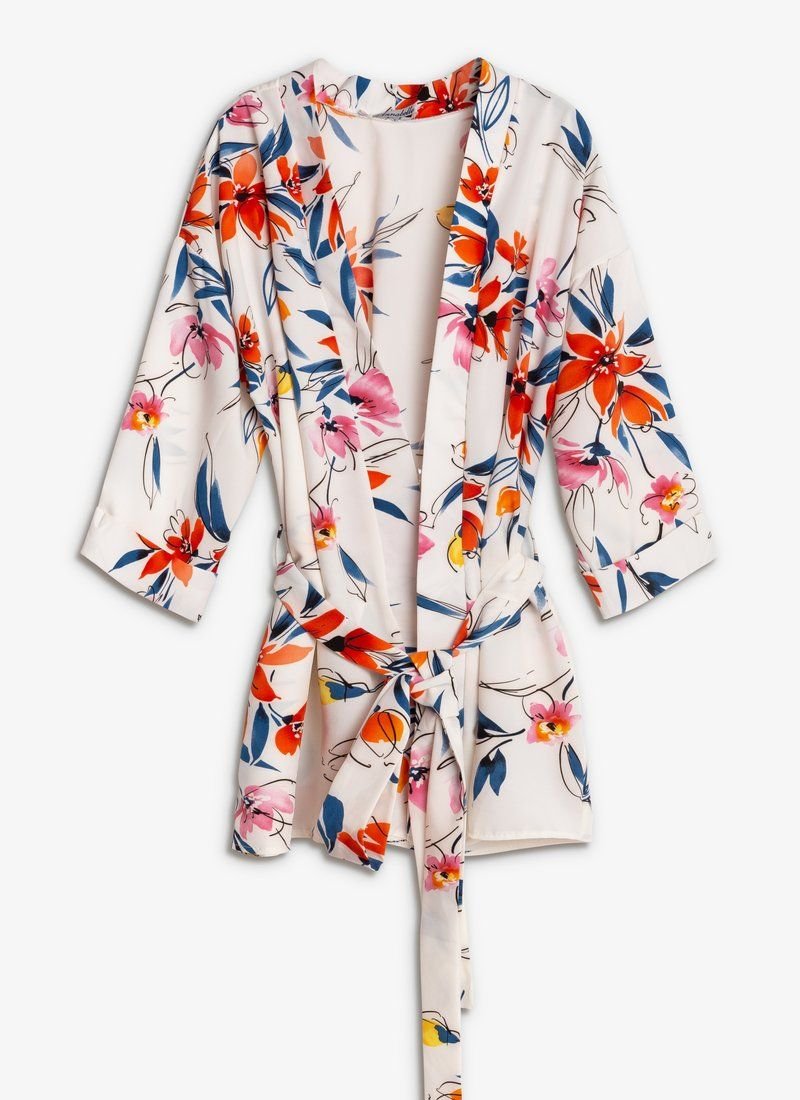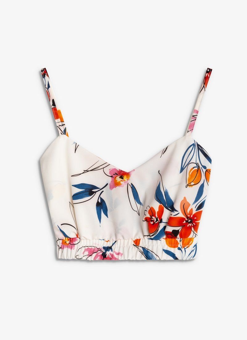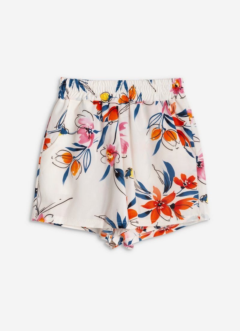A trendy set of flowing light fabric with a tropical print. The set includes short shorts with a high fit and two pockets on the sides. A cropped top with thin straps and an elastic back is complemented by a loose-fitting shirt with wide sleeves. The set includes a removable belt to match.