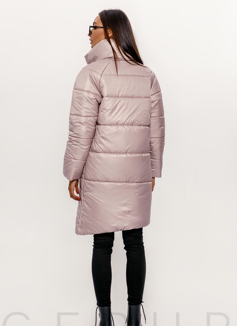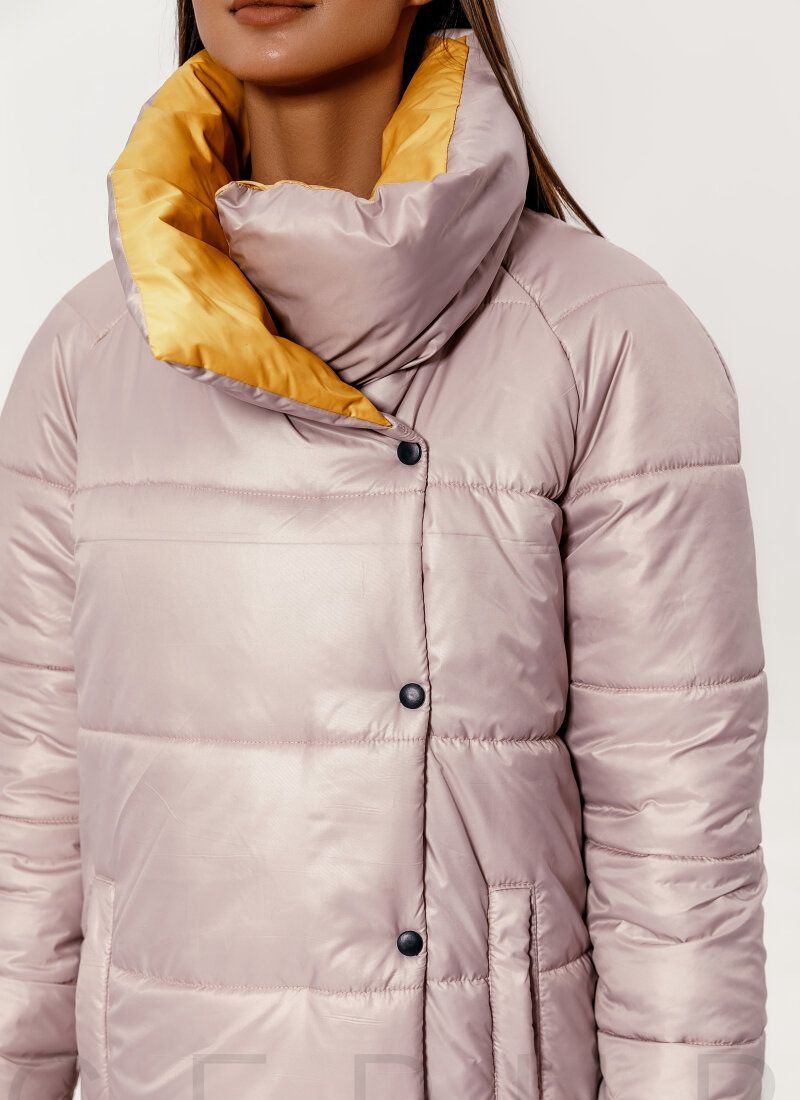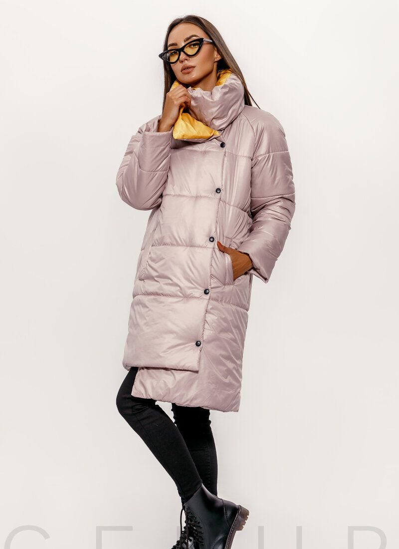 An elongated quilted jacket made in beige and yellow: a voluminous stand-up collar, a long sleeve, two welt pockets, a side strap with buttons, an asymmetric hem.Features: additional insulation - sintepon (150 g /m2). Please note that the product is designed for temperatures up to -5 °C.