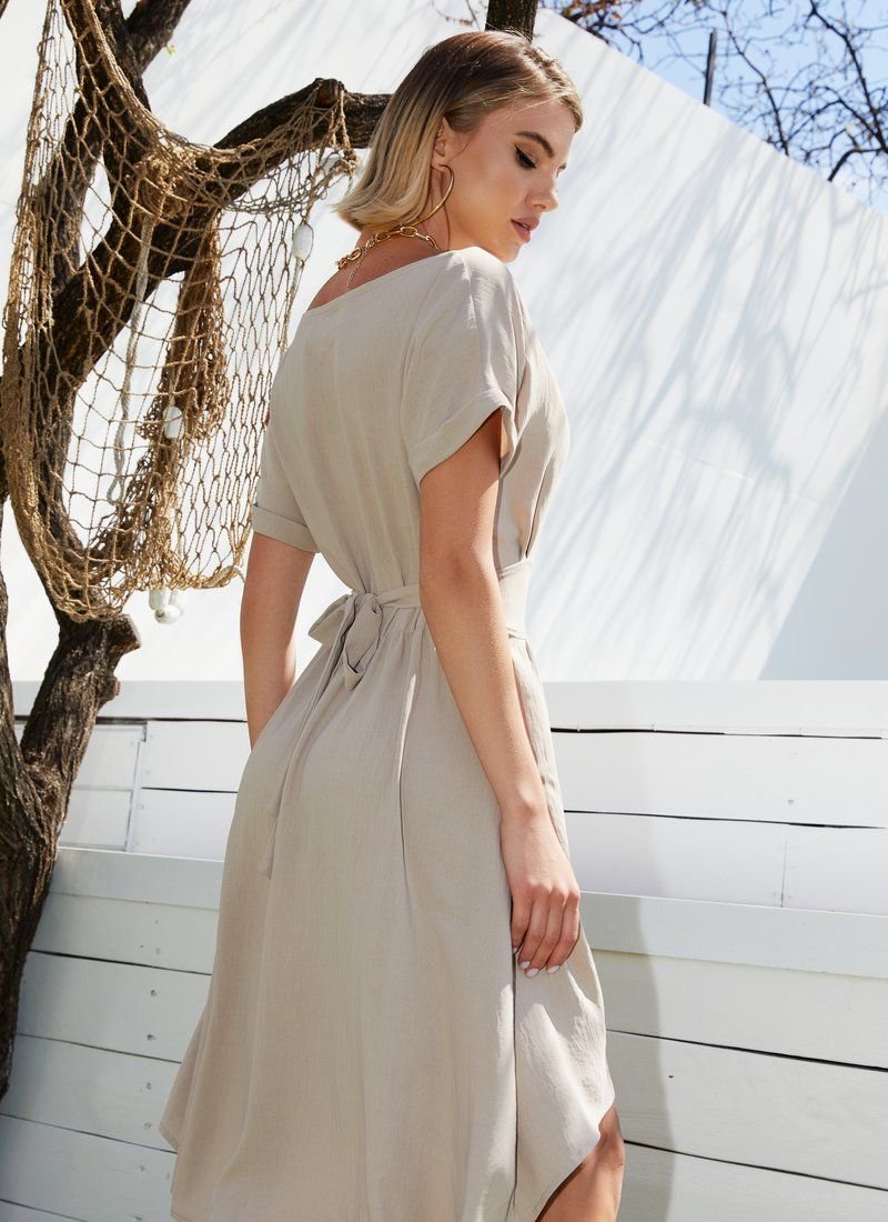 A plain beige dress is a godsend for lovers of easy chic. The lightweight material allows air to pass through well, being responsible for comfort during the day, and a calm coffee shade and a minimum of decor (only an asymmetric hem and a sewn belt) make the fitted model a comfortable companion for every day.