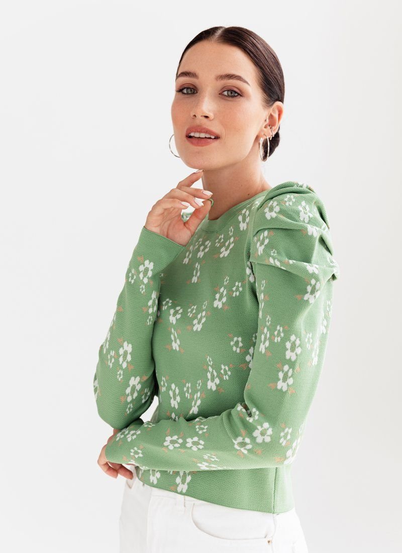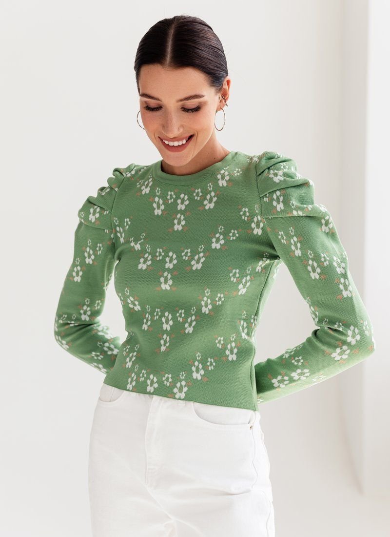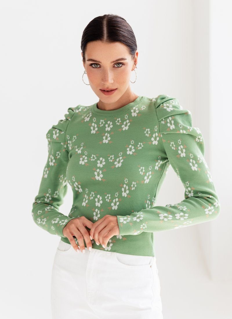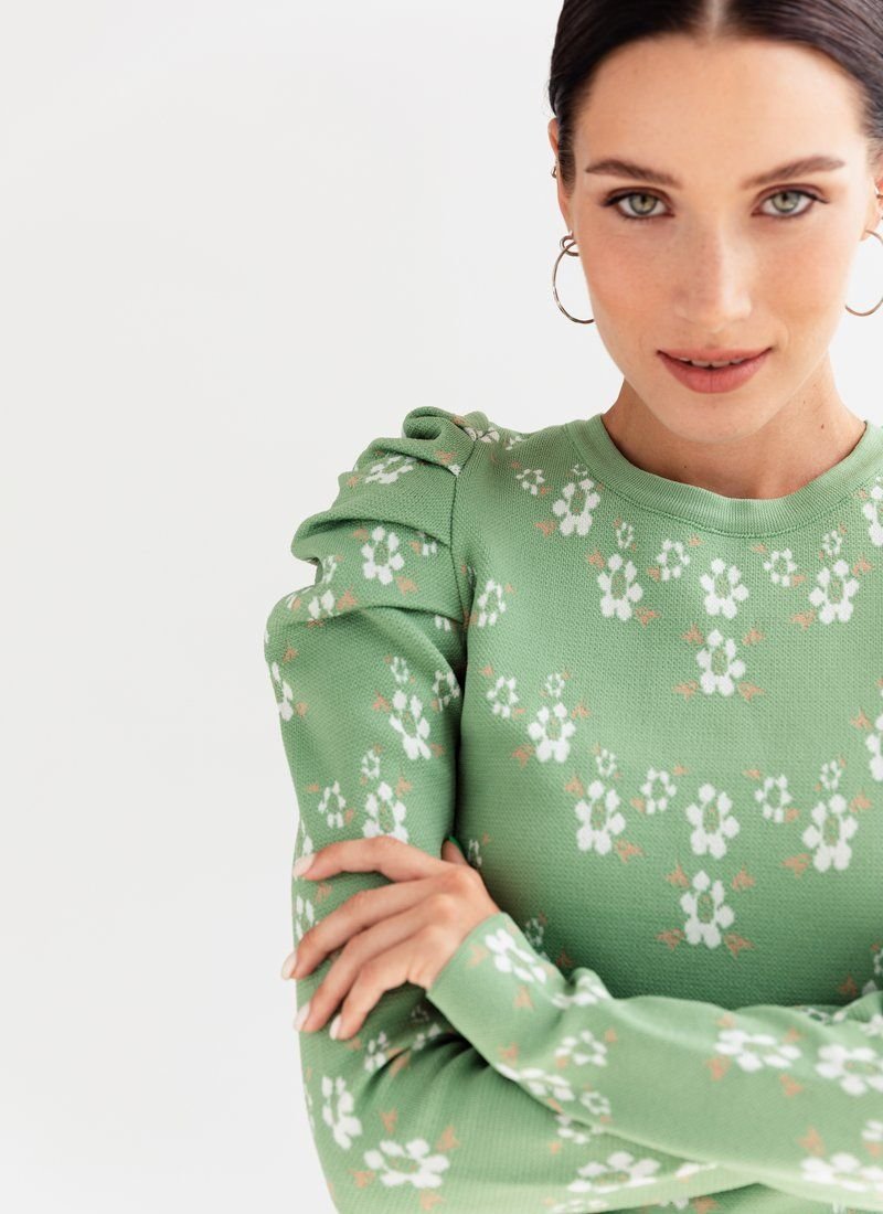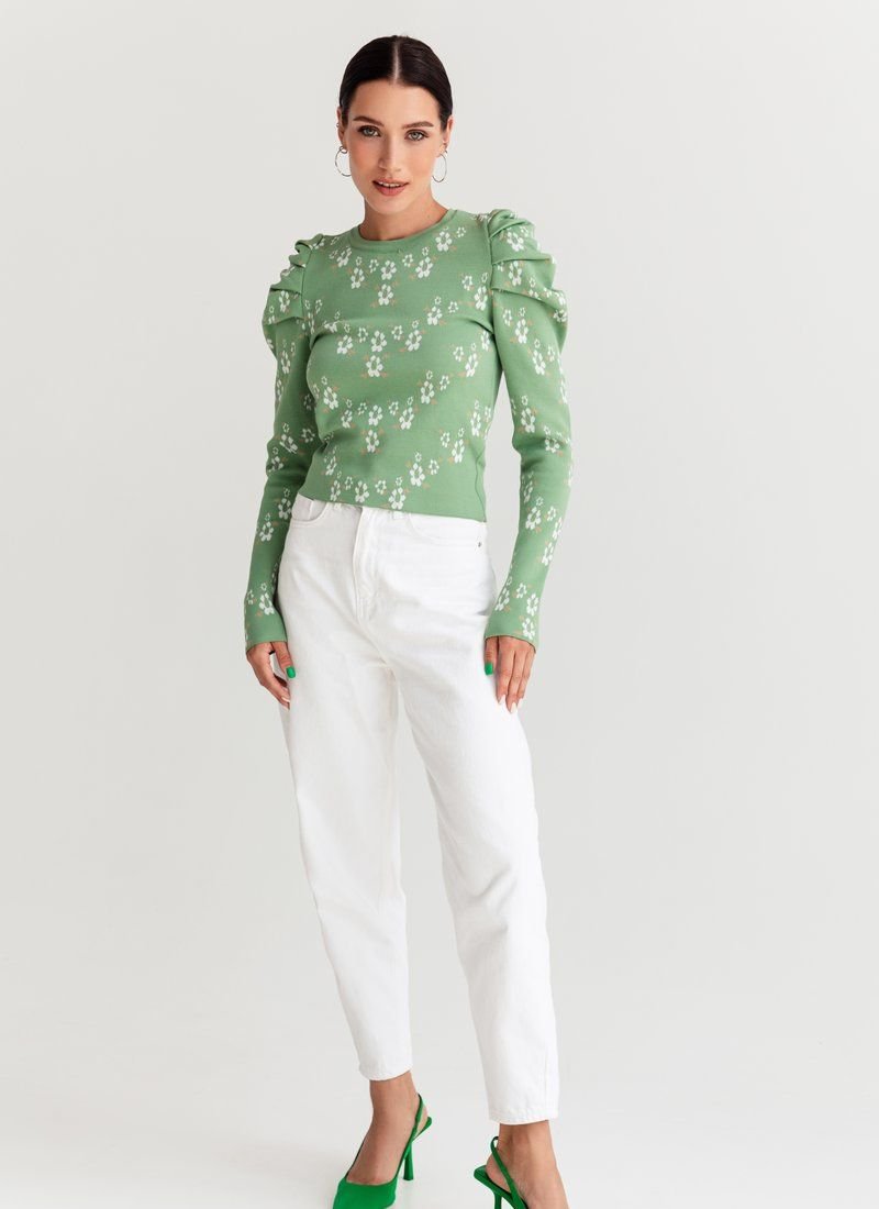 Knitted jumper in a delicate floral print. The model is decorated with lantern sleeves, which adds zest to it.