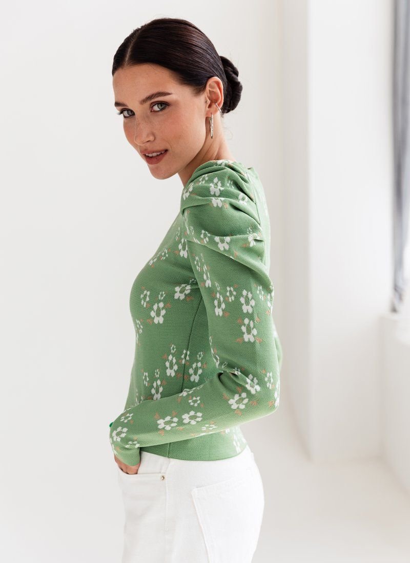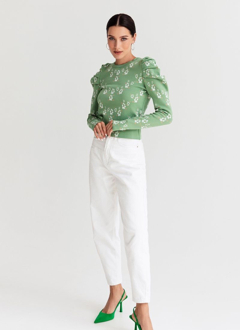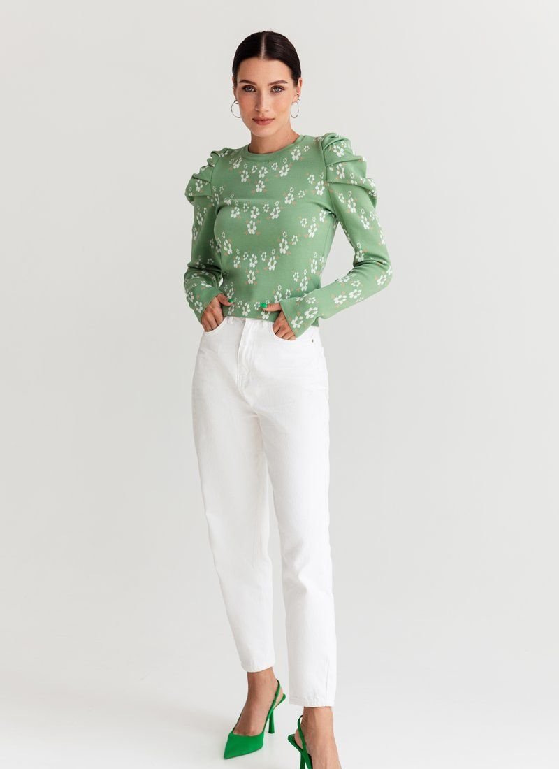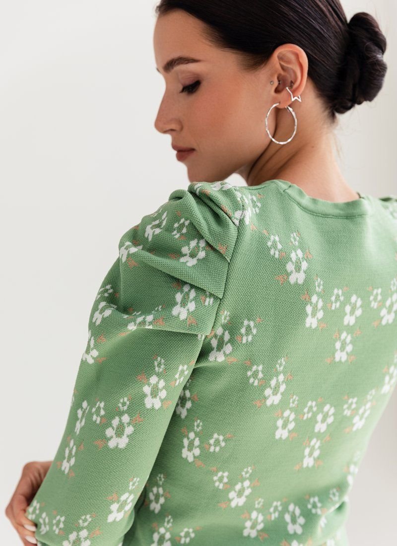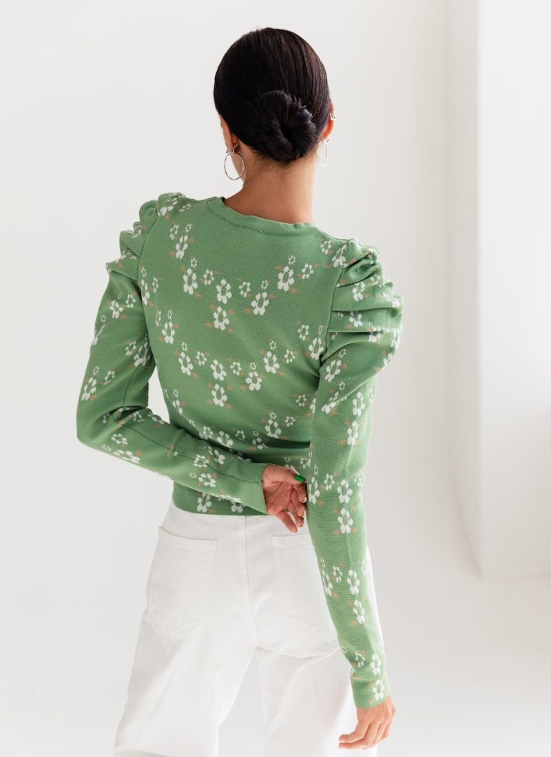 Knitted jumper in a delicate floral print. The model is decorated with lantern sleeves, which adds zest to it.