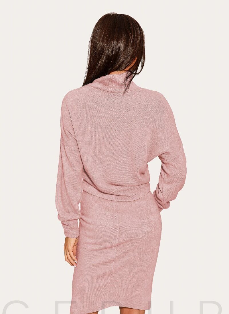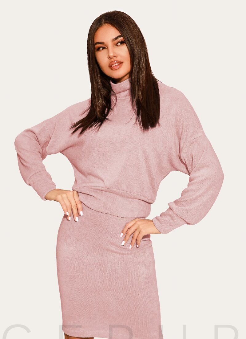 Trendy pink knitted suit: a jumper with a stand-up collar, raglan sleeve, elastic cuff and knitted bottom edge, a straight-cut skirt with an elastic insert at the waist and a high fit.