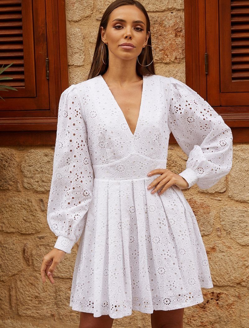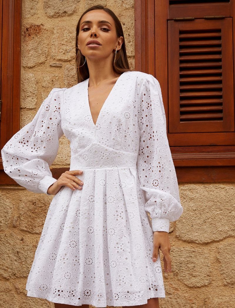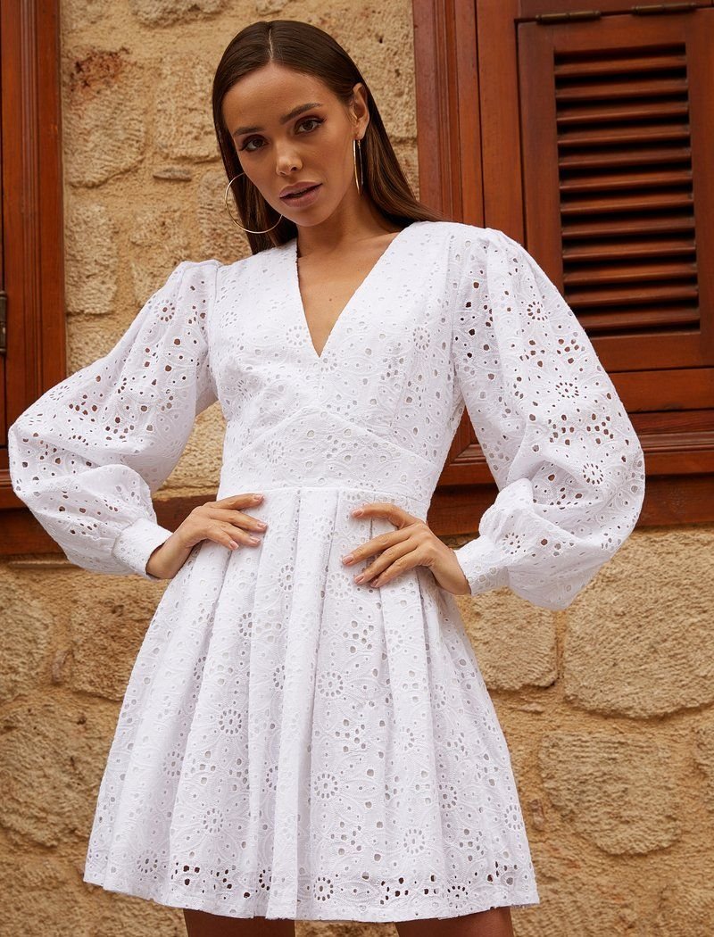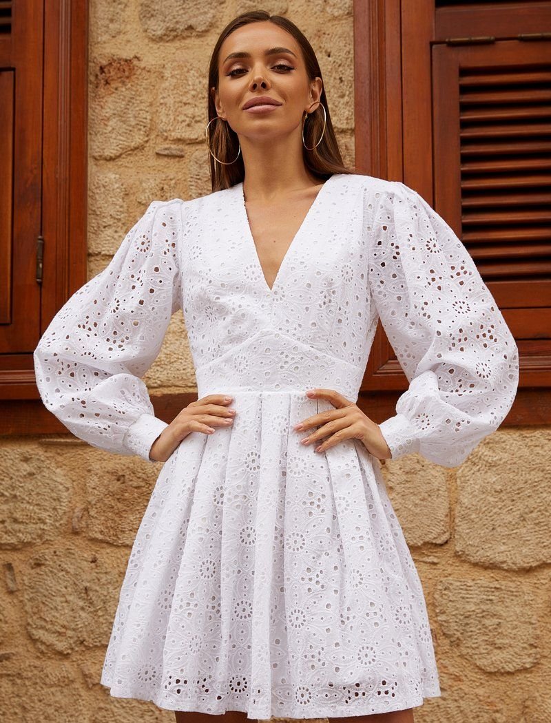 A white fitted mini dress does not tolerate competition. Due to the complex texture of the translucent material with embroidery, he needs a minimum of jewelry in the company: you can limit yourself to a clutch and matching shoes. To make the model show and hide equally, it was supplemented with a lining. The accent details were voluminous sleeves in the spirit of the SS21 Bottega Veneta and Balenciaga shows.
