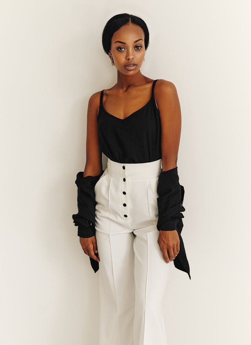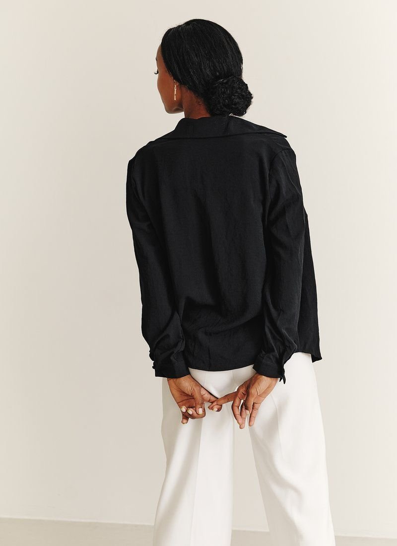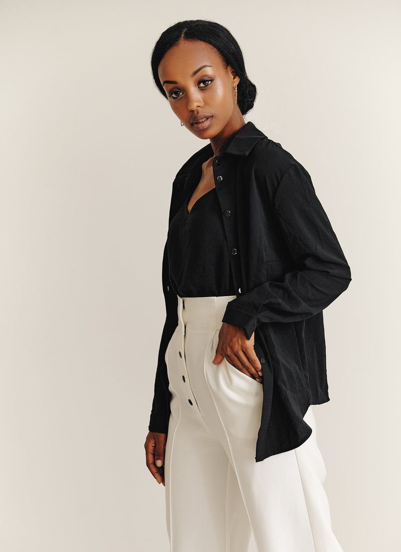 A set of a top and a black shirt. Button-down shirt with long sleeves, thin cuffs, with a turn-down collar. Straight cut top with thin adjustable straps, with an open back. Thanks to the versatility of things, they can be worn both together and separately, which will help create a lot of images.