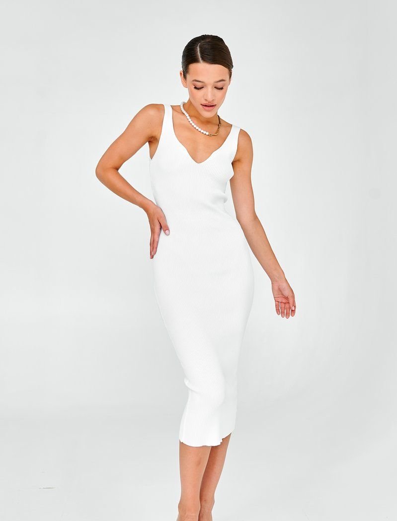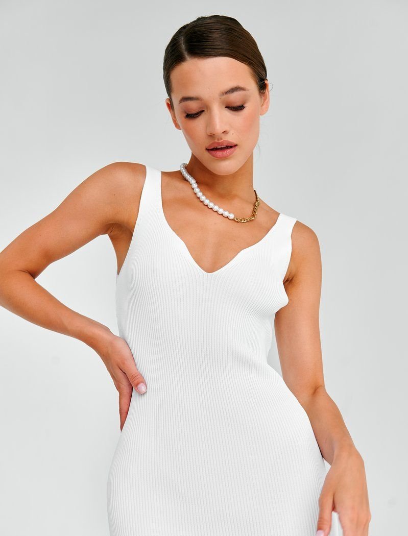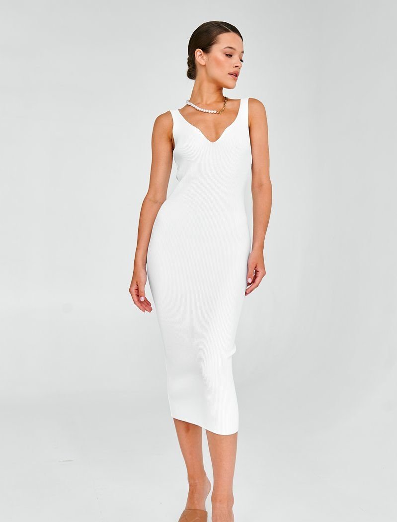 A delicate white midi dress with a v - neck on wide straps. It will beautifully emphasize your figure and will be an excellent choice for both a casual image and an evening out.