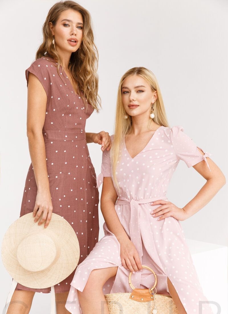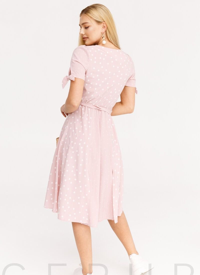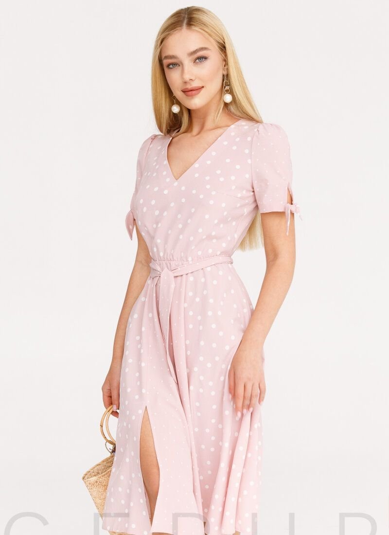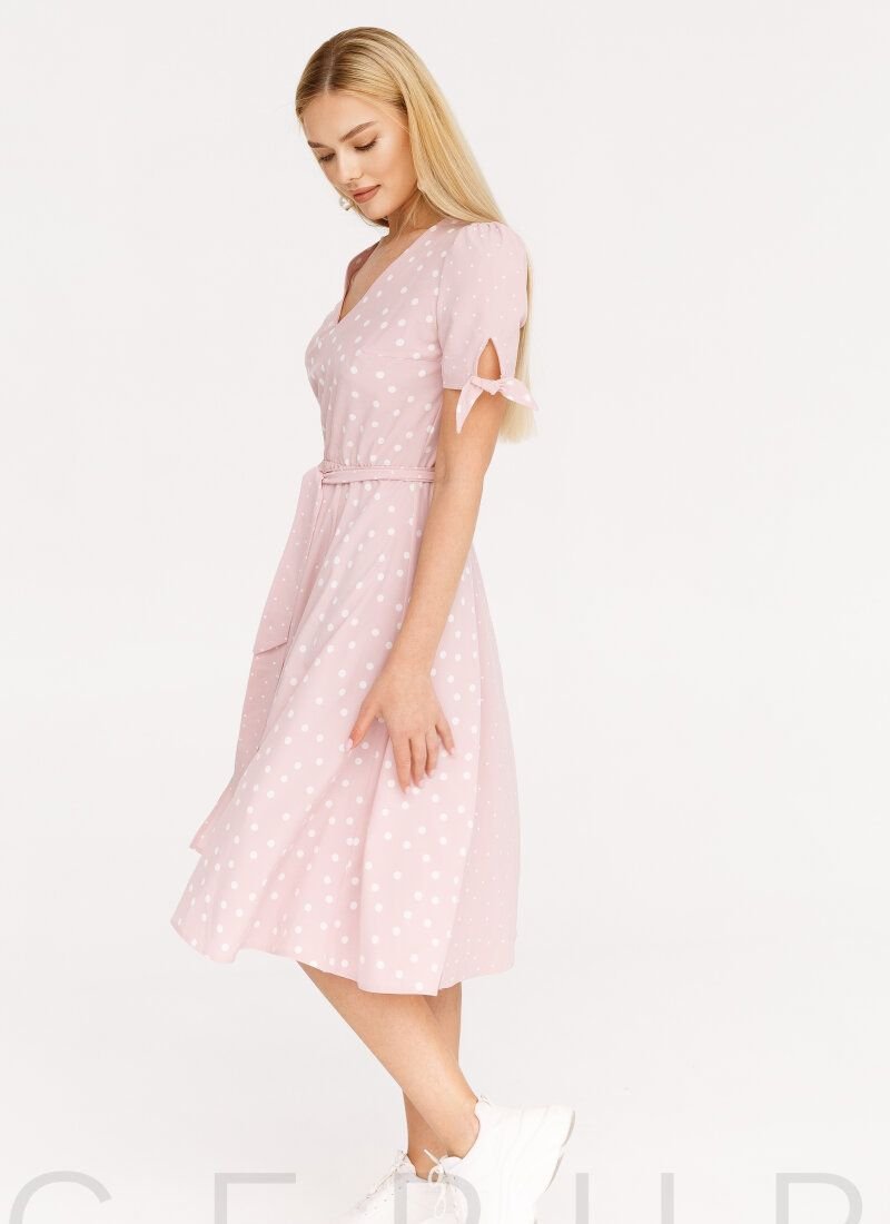The dress is a delicate light pink color with a combined print of white polka dots. Shallow v-neck, short voluminous sleeves with ties. Elastic insert at the waist, complemented by a removable fabric belt and a flared skirt in a fold.