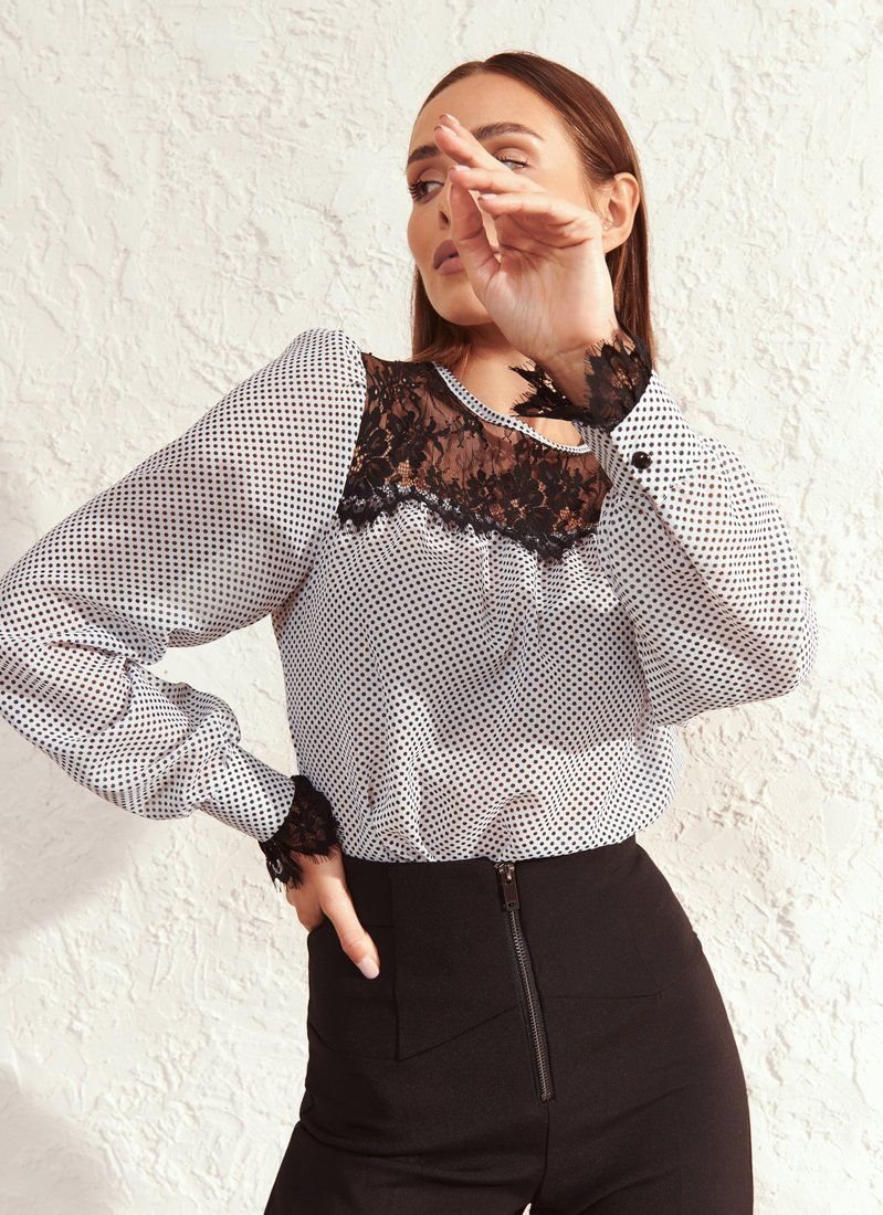 The black and white blouse includes romance to the maximum. This is responsible for the light airy chiffon in small polka dots - a print that has become universal in the women's wardrobe according to Vogue. The mood is also supported by lace with a floral motif on the yoke and cuffs of the sleeves.