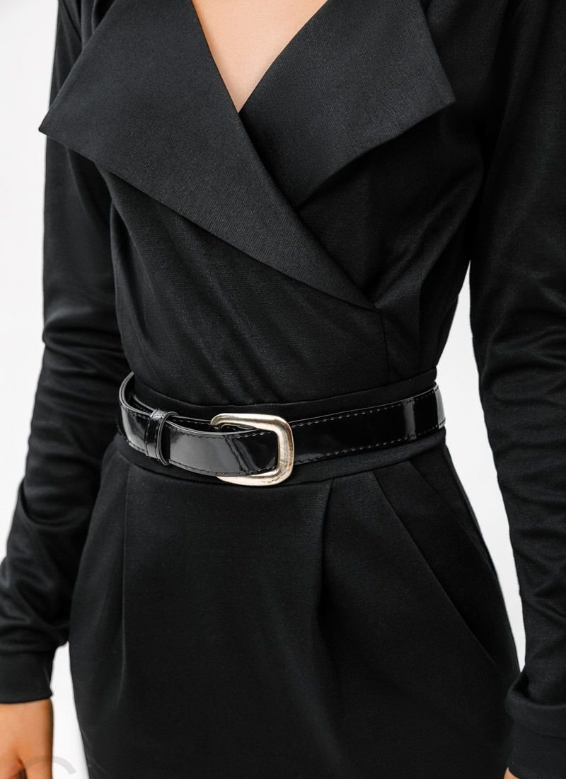A form-fitting knitted dress in black with a deep v-neck, lapels, long sleeves, a skirt with pinches and a small slit in the back, complemented by a removable eco-leather belt.