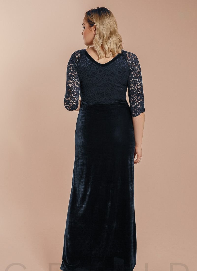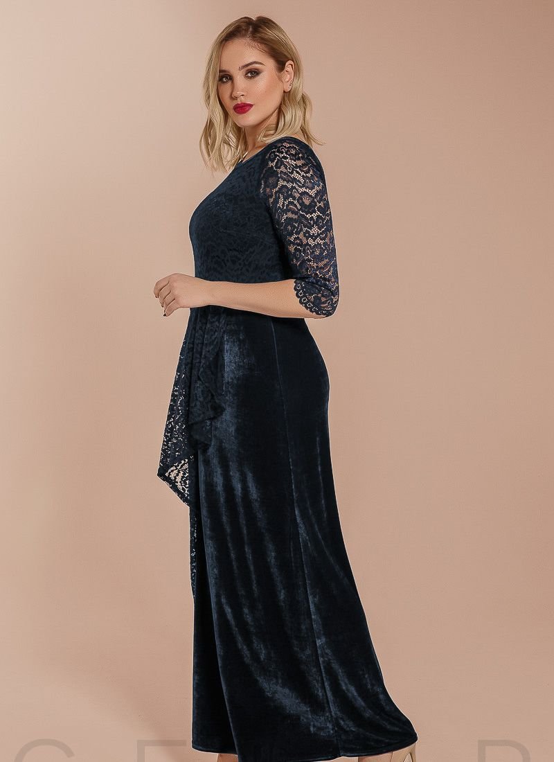 An evening dress made of velour, decorated with lace to match: a neat boat neckline, a transparent sleeve and a flared skirt with original drapery.