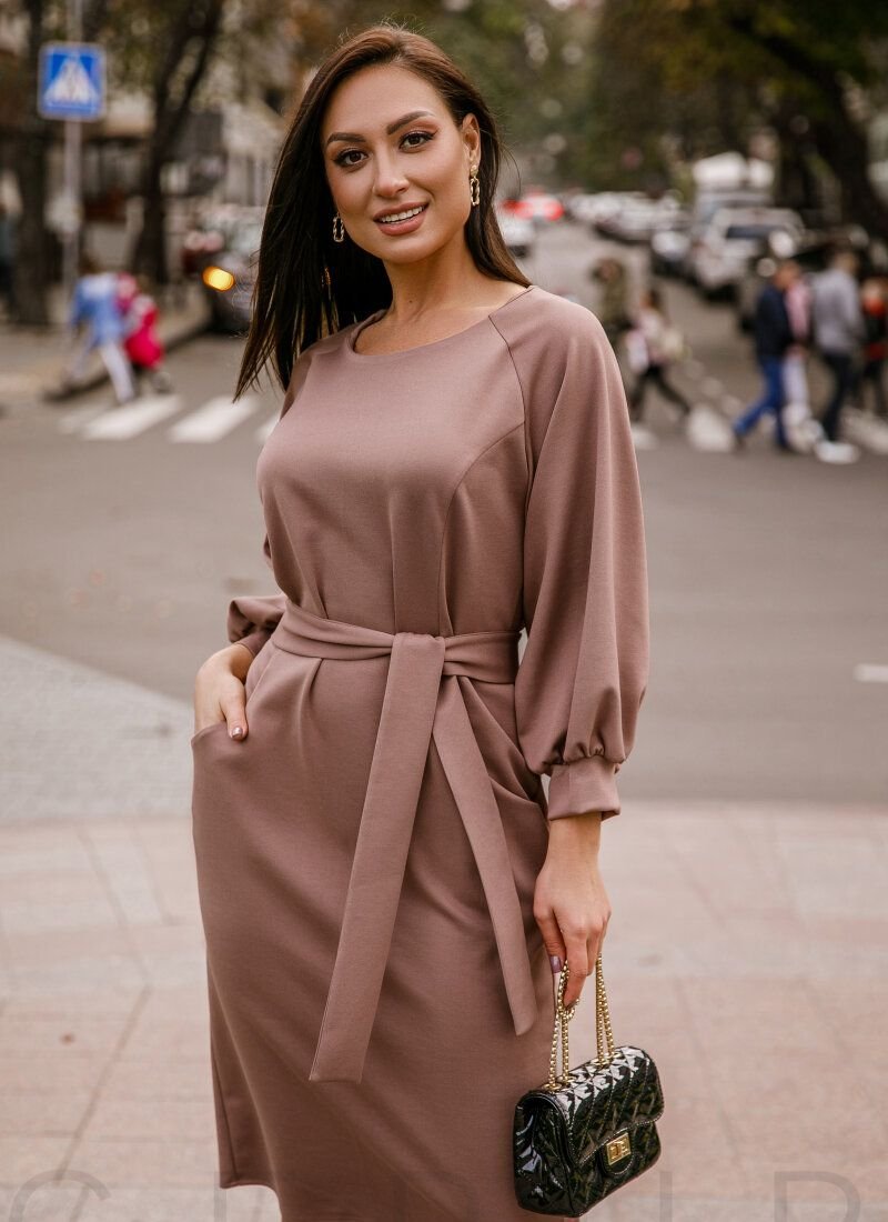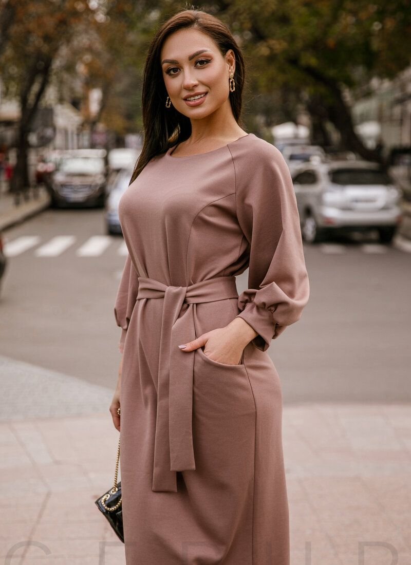 A fitted midi dress made of elastic Italian knitwear: round neck, one-piece voluminous sleeves on a wide cuff, modeling recesses, two side pockets in the seams, a straight-cut skirt with a slit in the back, complemented by a removable plain belt.