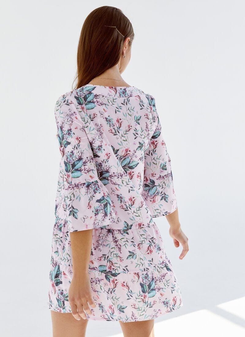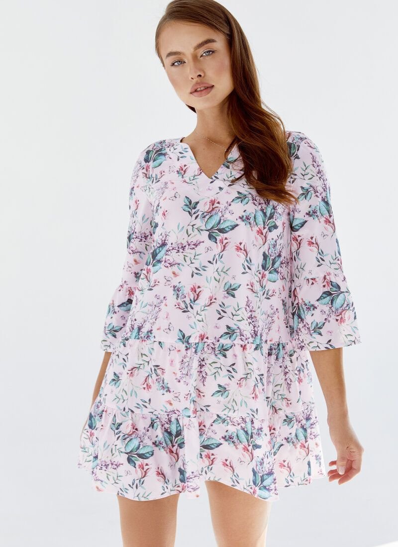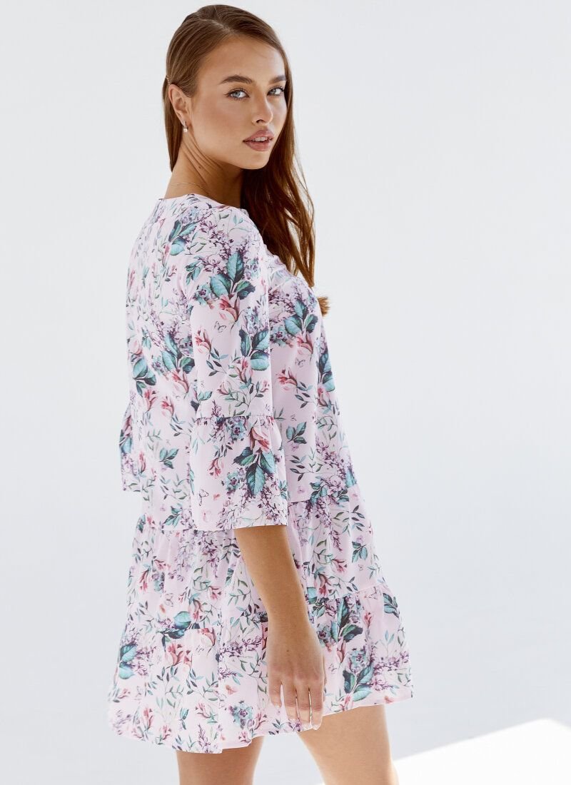 Women's wardrobe is difficult to imagine without a dress with a floral print. In the SS’2021 season, floral motifs can be found in the brands: Michael Kors, Celine, Chanel. The loose cut of the pink-tinged model was complemented with flounces on the sleeves and hem. The decollete area is formed by a small v-shaped neckline.
