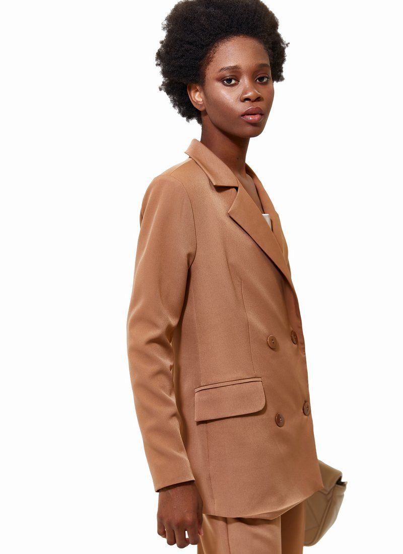 The pantsuit has already become a basic part of the wardrobe. We have a beige model in front of us. Double-breasted lined jacket with inserts in the shoulders for a better shape, rectangular lapels, with pockets. High-waisted trousers with buttons and zippers, with pockets on the sides.