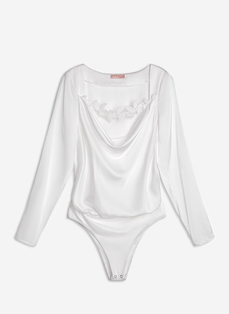 Gepur designers have given a lingerie-style bodysuit seductiveness due to lace trim and a translucent insert. In combination with a skirt and stiletto shoes, such a thing will become the basis of a sophisticated image.