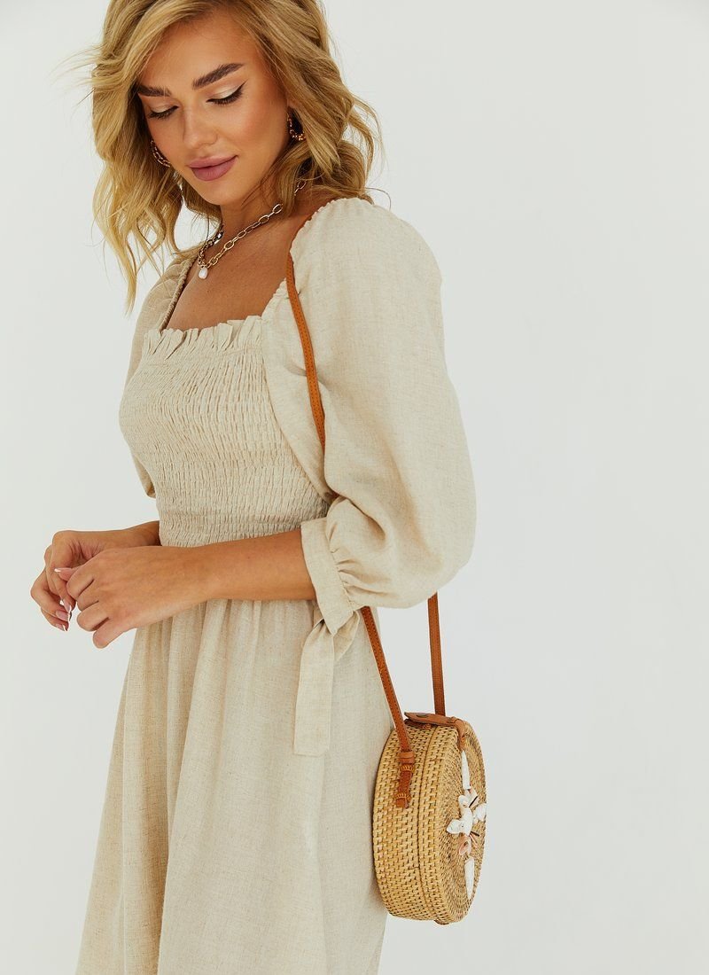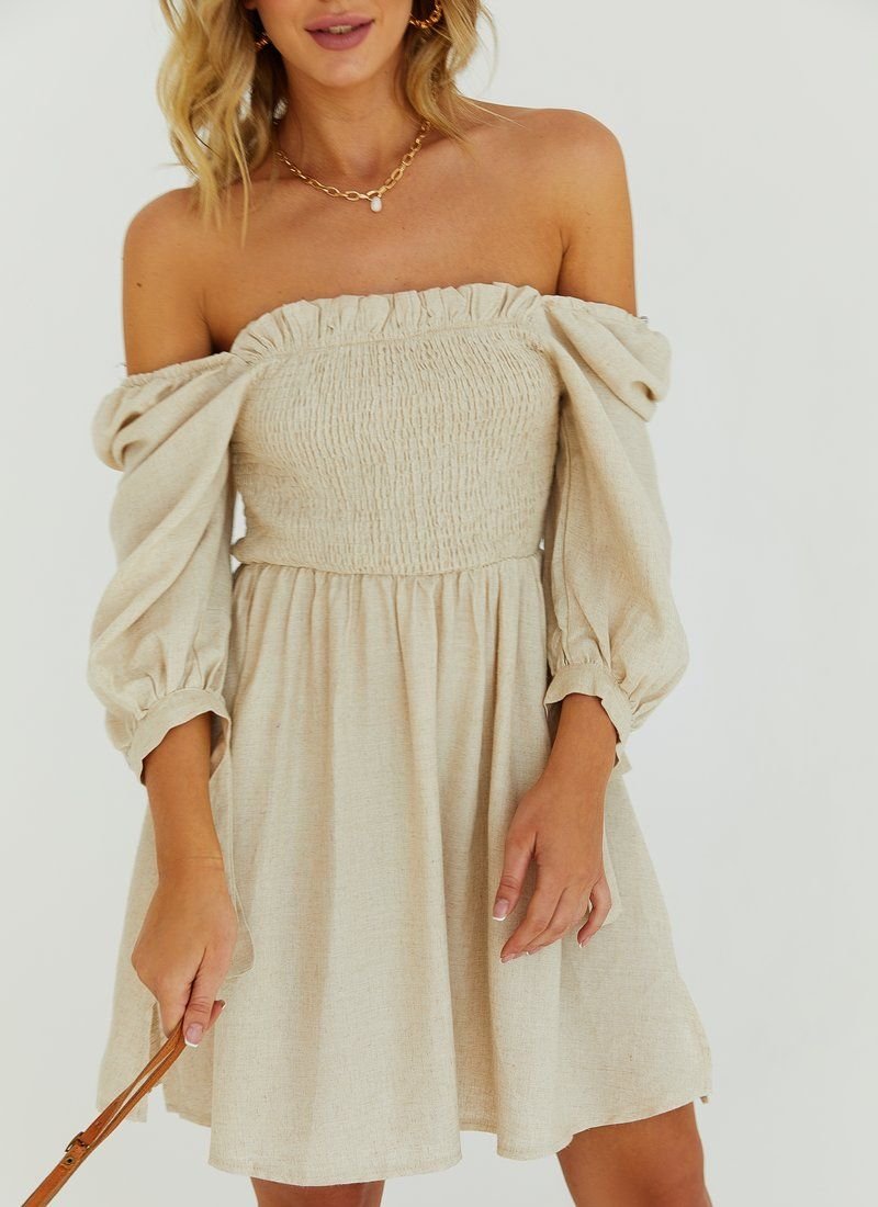 A beige mini dress with an inflated waist, elastic bodice and a deep square neckline will be especially relevant on hot days. Lightweight solid-color model with 3/4 lantern sleeves is sewn from a breathable thin linen-based material.