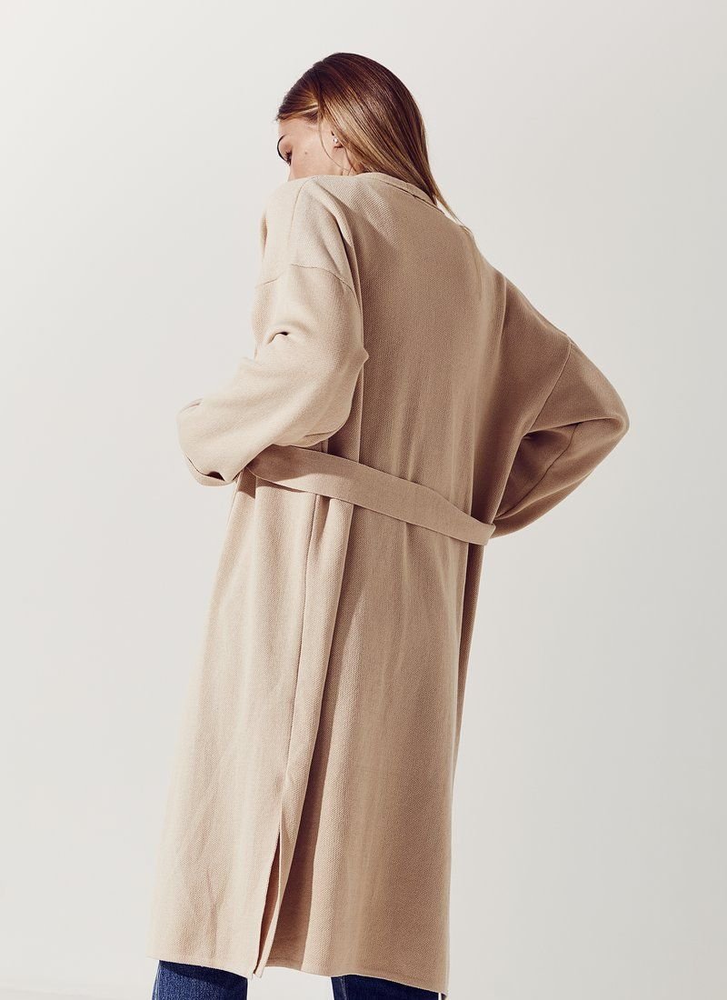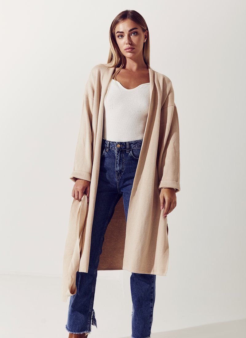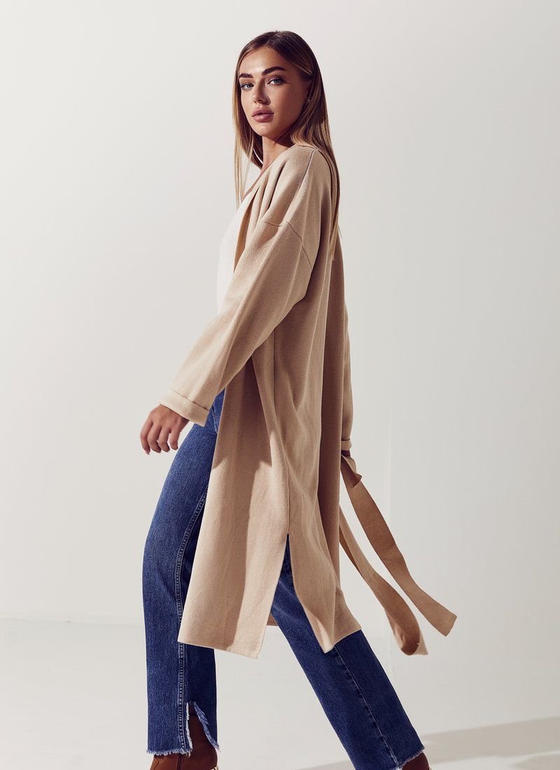 A basic oversize beige cardigan in knee-length colors will add an accent to your look. The set includes a matching belt, and the model is stylized with slits on the sides.
